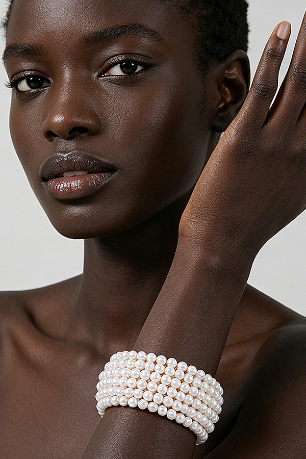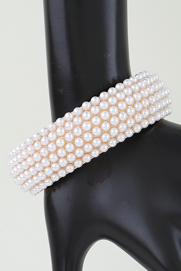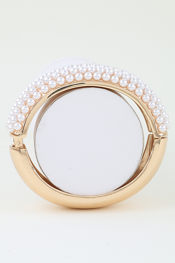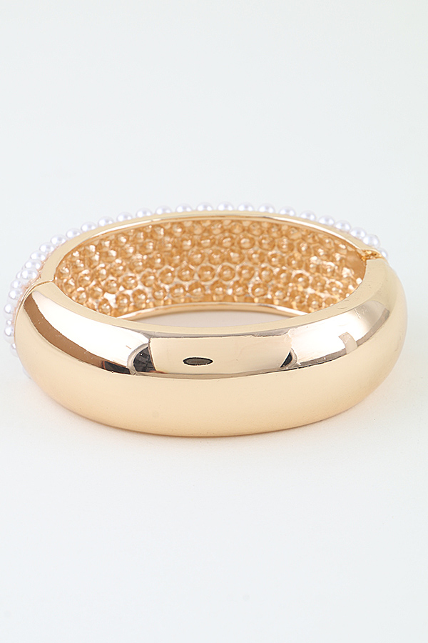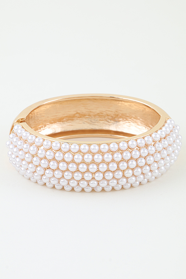 - * This Pearl Embedded Wide Cuff Bracelet from H&D Accessories is adorned with densely packed, lustrous pearls across its wide band for a luxe, eye-catching finish. Its structured cuff design delivers a bold, elegant silhouette that elevates any look, from casual daytime outings to formal evening events. Wear it to weddings, date nights, or office meetings to add a timeless, sophisticated touch to your ensemble. The hinged closure ensures a secure, comfortable fit, making it a standout piece for any jewelry collection.