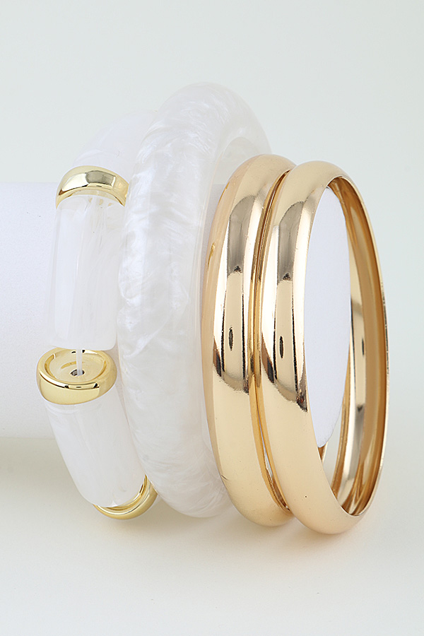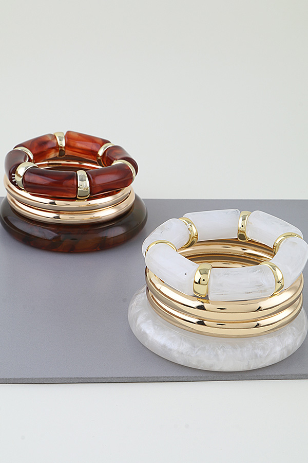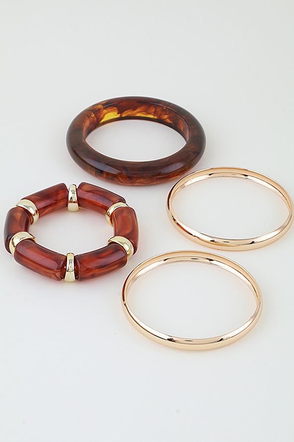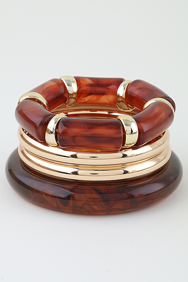 • * This set from H&D Accessories includes a modern tortoise cuff bracelet with a marbled, organic pattern, alongside complementary bangles. The tortoise piece features a thick, rounded profile with a glossy finish, while the set also includes sleek, thin metal bangles and a resin bangle with metallic accents. The layered design offers versatile styling, blending bold texture with polished minimalism for a contemporary, eye-catching look.