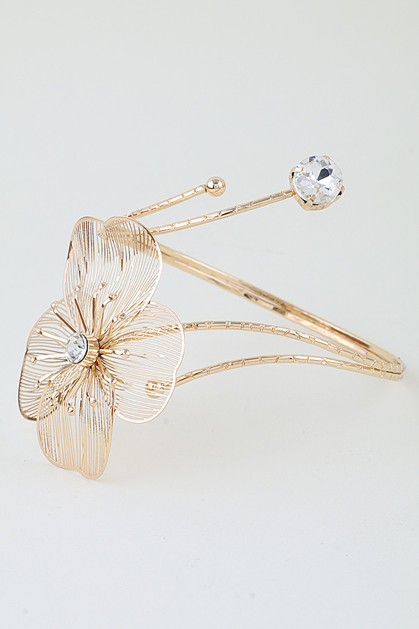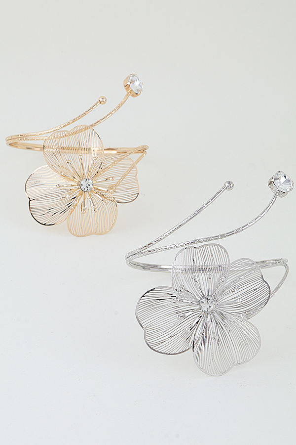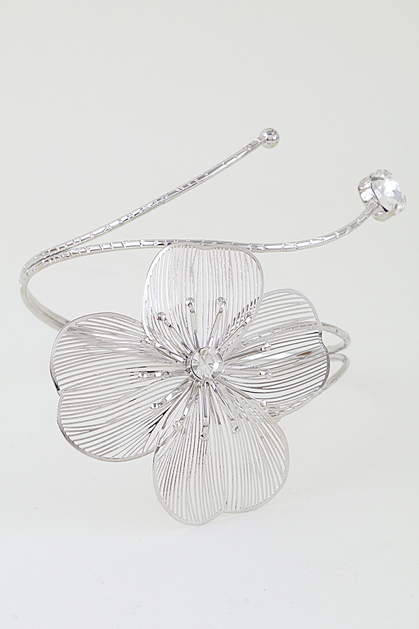 - * This Blooming Flower Arm Cuff from H&D Accessories features an open, adjustable design with a large, intricate open-work floral motif, accented by shimmering focal stones at the center and tip. Its delicate wire detailing adds a romantic, eye-catching element to any ensemble. Wear it to elevate a flowy sundress at a garden party or to complement a sleeveless blouse for a daytime brunch. The flexible construction ensures a comfortable, secure fit, making it a striking choice for both casual and special occasions.