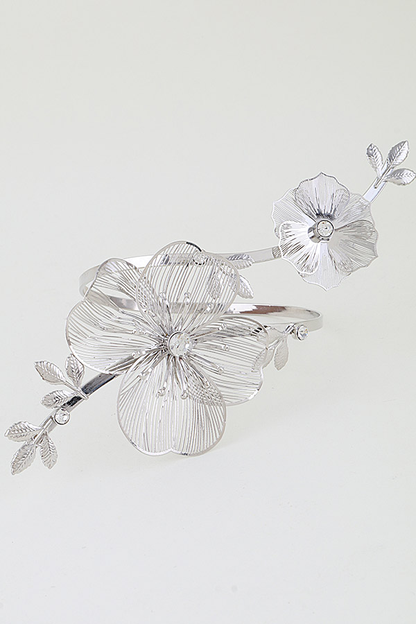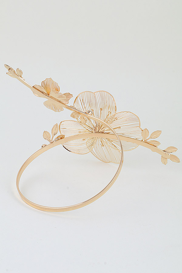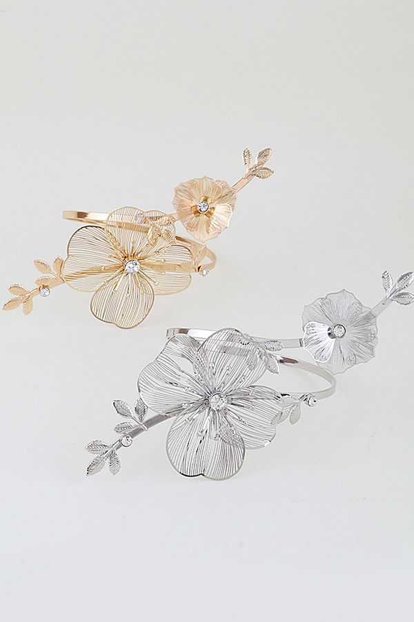 - * This Delicate Flower Vine Arm Cuff from H&D Accessories features an open, adjustable design with intricate open-work floral motifs and leafy accents, each anchored by a shimmering focal stone. Its botanical, vine-like structure adds a romantic, ethereal touch to any ensemble. Wear it to elevate a flowy sundress at a garden party or to complement a sleeveless blouse for a daytime brunch. The flexible construction ensures a comfortable, secure fit, making it a striking choice for both casual and special occasions.