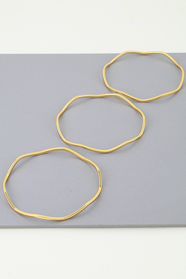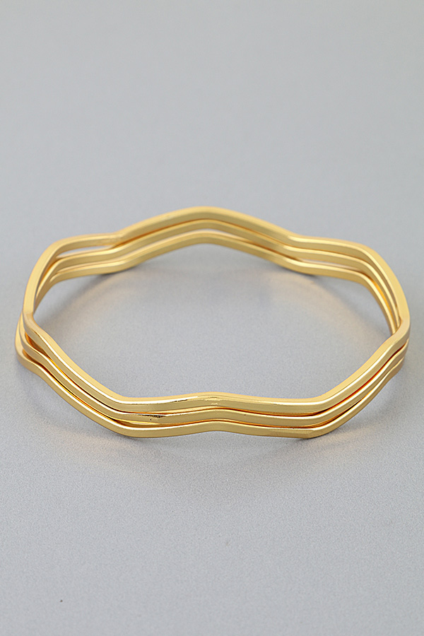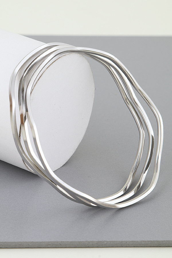 • * This Triple Polished Stacked Bangle Bracelet from H&D Accessories features a set of fluid, organic-shaped bangles with a gently undulating, wave-like silhouette. Each piece is crafted with a smooth, polished finish that catches light softly, creating a subtle yet eye-catching effect. The lightweight, stackable design allows for effortless layering, either worn together as a cohesive set or mixed with other pieces for a personalized look. Its flexible, streamlined construction ensures comfortable all-day wear, making it a versatile staple for both casual and elevated ensembles.