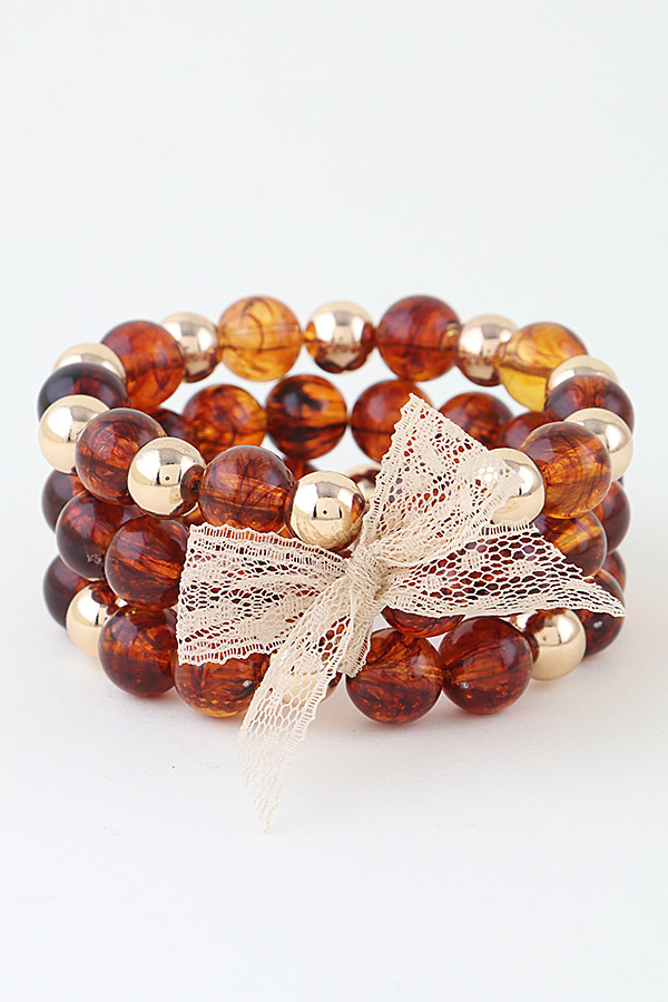 - * This Lace Ribbon Tortoise Beaded Bracelet from H&D Accessories is a multi-strand piece that combines textured, patterned beads with smooth, polished accents, finished with a delicate lace ribbon detail. The layered design brings a soft, decorative touch to any lookâwear it when attending a garden tea party to complement a flowy blouse, or pair it with a casual top for a charming, put-together vibe during a weekend stroll. Its blend of intricate beading and gentle ribbon styling makes it a versatile accessory that adds a subtle, whimsical flair to both relaxed and softly elegant occasions.