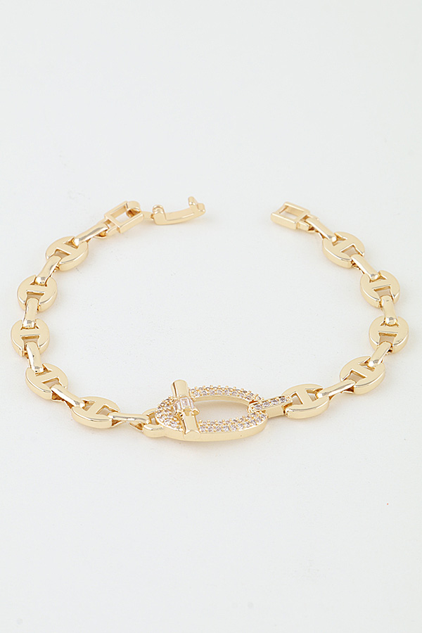- * This Bejeweled Oval Toggle Mariner Chain Bracelet from H&D Accessories features a polished mariner chain, centered with a bold oval toggle clasp encrusted with shimmering pavé crystals. The classic mariner links provide a structured, nautical-inspired base, while the crystal-encrusted toggle creates a glamorous focal point that catches light with every movement. The secure toggle closure ensures a comfortable fit, and the mix of sleek metal and sparkling detail makes it a versatile piece that balances timeless charm with modern sparkle.