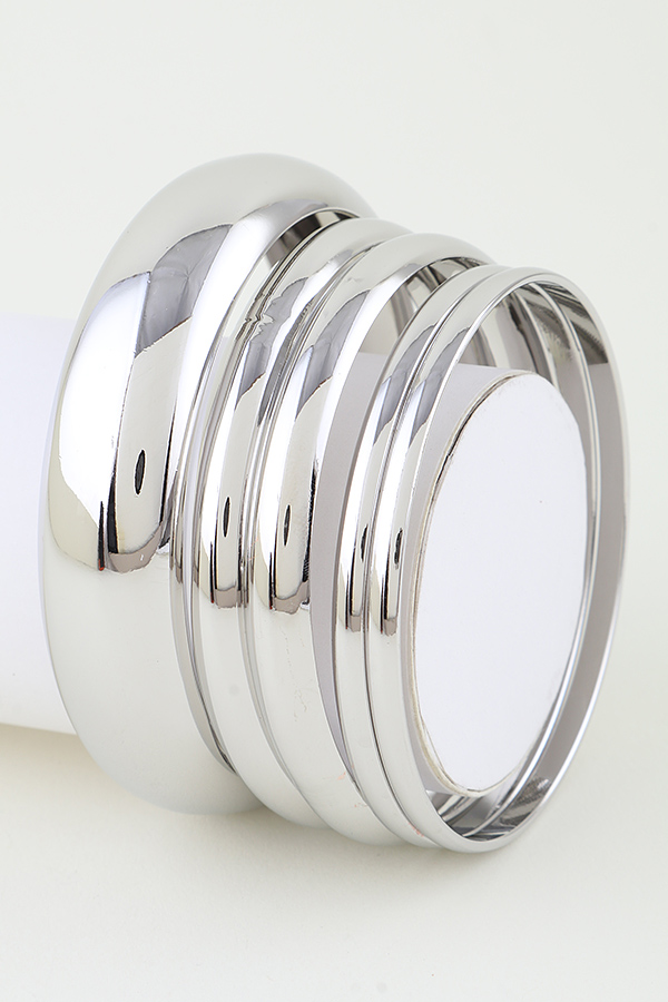 - * This is a set of bracelets with a sleek, polished finish, showcasing a layered, stacked design. It is the Multi Stacked Bangle Bracelet, From H&D Accessories, featuring multiple circular bands that create a stylish, dimensional look, perfect for adding a touch of elegance to any ensemble.