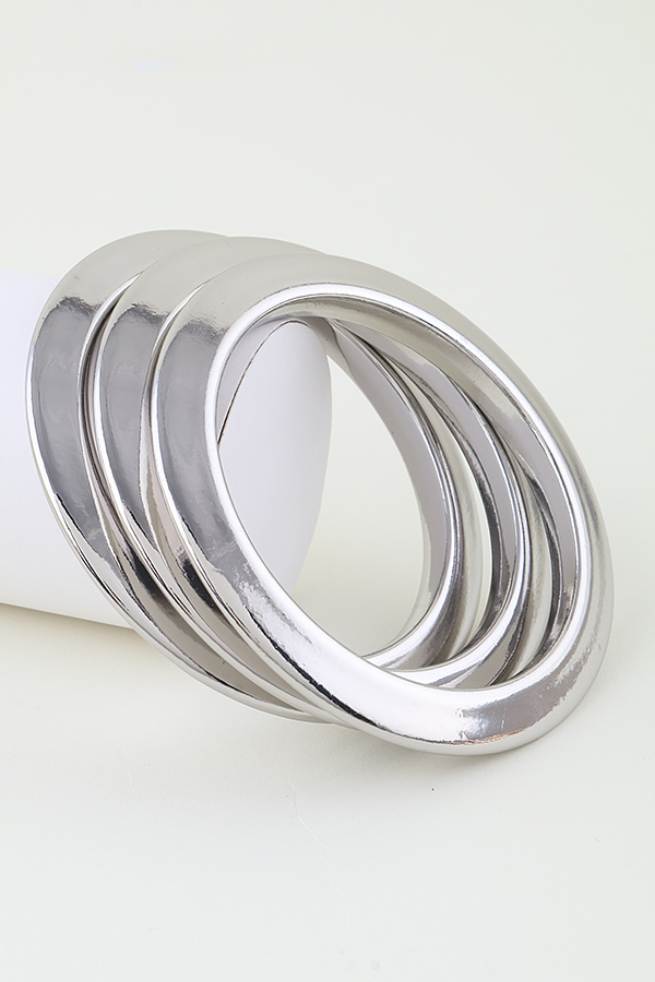 - * This Triple Disc Bangle Bracelet from H&D Accessories features three overlapping disc-shaped bangles. The smooth, polished design creates a sleek and layered look, with each bangle seamlessly connected to offer both style and comfort. Its minimalist yet bold structure makes it a versatile piece that adds a touch of elegance to any accessory collection.