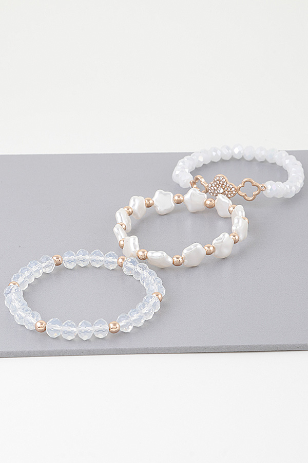 - * Introducing the "Trinity White Charm Bracelets" – a stunning trio of elegance that combines the purity of white beads with the enchanting allure of multi-clover crystals. Elevate your accessory game with this exquisite stack that effortlessly complements any outfit, making it a must-have for every fashion enthusiast.