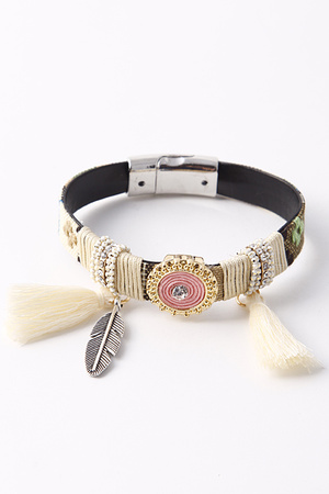 Center Rhinestone Yarn Tassel Leaf Charm Bracelet 5ECJ1