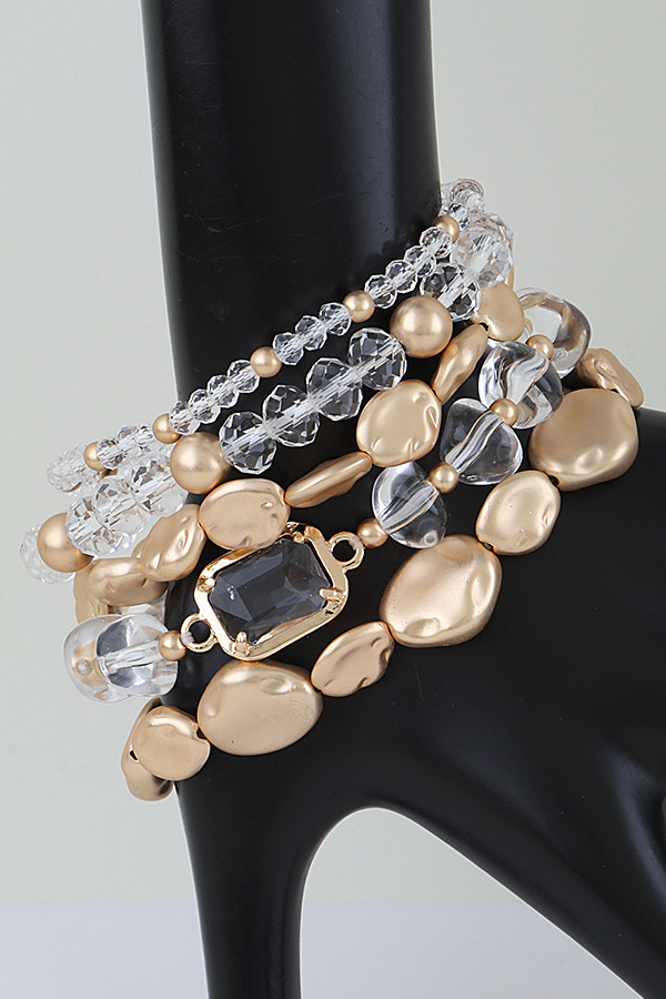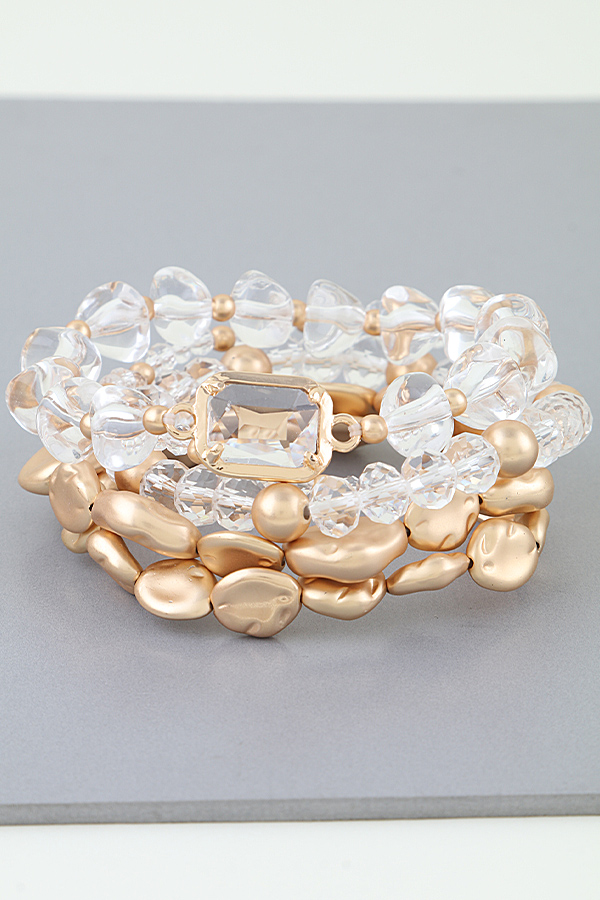 - * This Modern Crystal Stone Beaded Accessory Bracelet from H&D Accessories boasts a multi-layered design with textured metallic beads, sparkling faceted crystals, and a bold rectangular stone centerpiece for dramatic flair. Its stacked structure adds striking dimension to your wrist, making it a standout statement piece. Ideal for elevating evening events, dinner dates, or special occasions, it also adds a touch of glamour to casual daytime looks. The flexible, stretchable construction ensures a comfortable, customized fit for all-day wear.