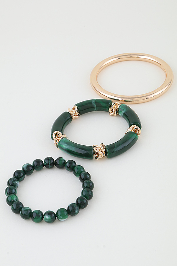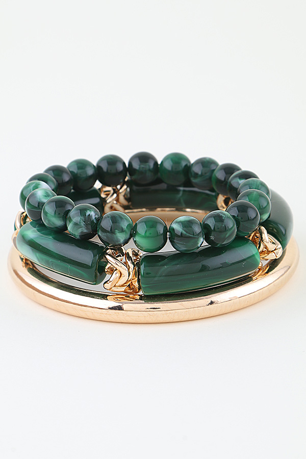 - * This Multi Marble Tube Beaded Bracelet from H&D Accessories is a layered set featuring two distinct styles: one strand of smooth, cylindrical tube elements, and another of rounded, polished beads—both with a marbled finish. It’s accented by sleek metal details and linked with small chains for flexibility.The mixed textures and layered design make it a versatile piece, ideal for adding a textured, cohesive touch to everyday looks or complementing statement outfits with its balanced, eye-catching silhouette.