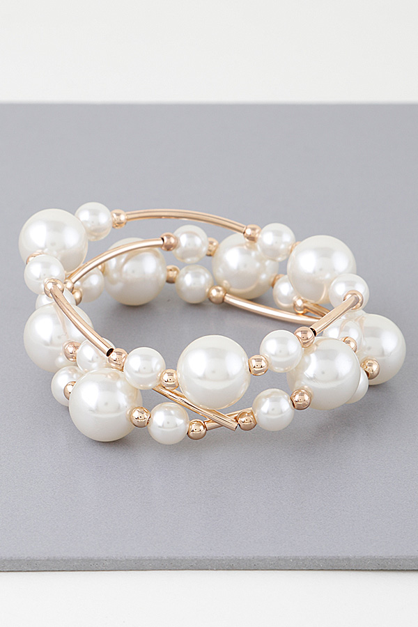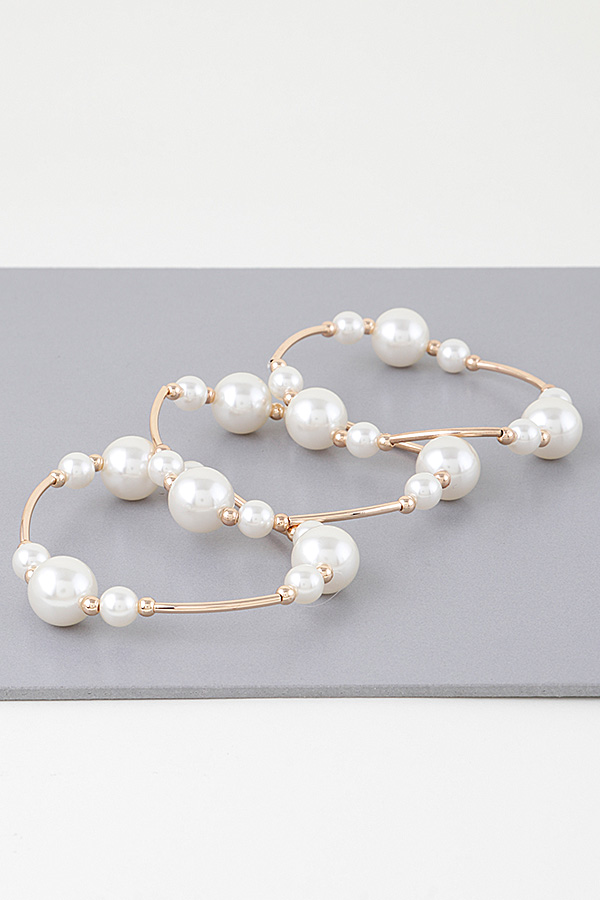 • * Introducing the "Triple Multi Pearl Wire Bracelet" – a stunning fusion of white pearls and luxurious gold beads that embodies sophistication and charm. Elevate your accessory game with this exquisite piece from H&D Accessories, perfect for any occasion.