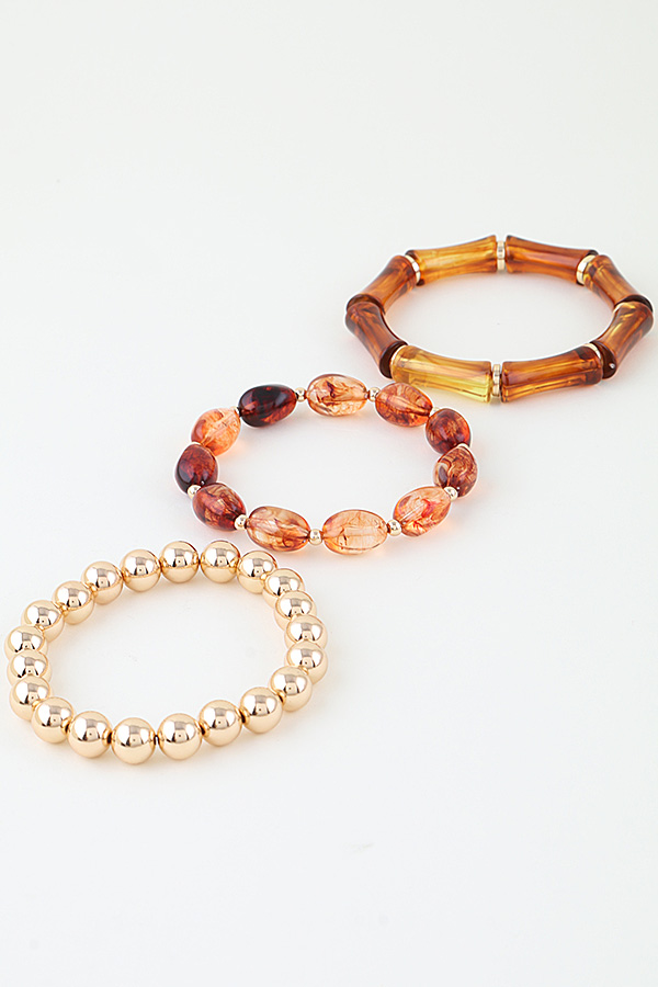 - * This Triple Tortoise Beaded Bracelet from H&D Accessories is a three-piece set that blends distinct styles: a polished spherical beaded band, a textured oblong beaded piece, and a segmented cuff with sleek connectors. Its varied design offers flexible styling options: wear all three together for a layered, dynamic look when heading to a casual dinner with friends, or pair one piece alone to add a subtle, refined touch to a workday blouse. The mix of smooth metallic beads, patterned oblong beads, and segmented details allows it to transition seamlessly between relaxed social gatherings and polished daily outfits, bringing a versatile, charming flair to any ensemble.