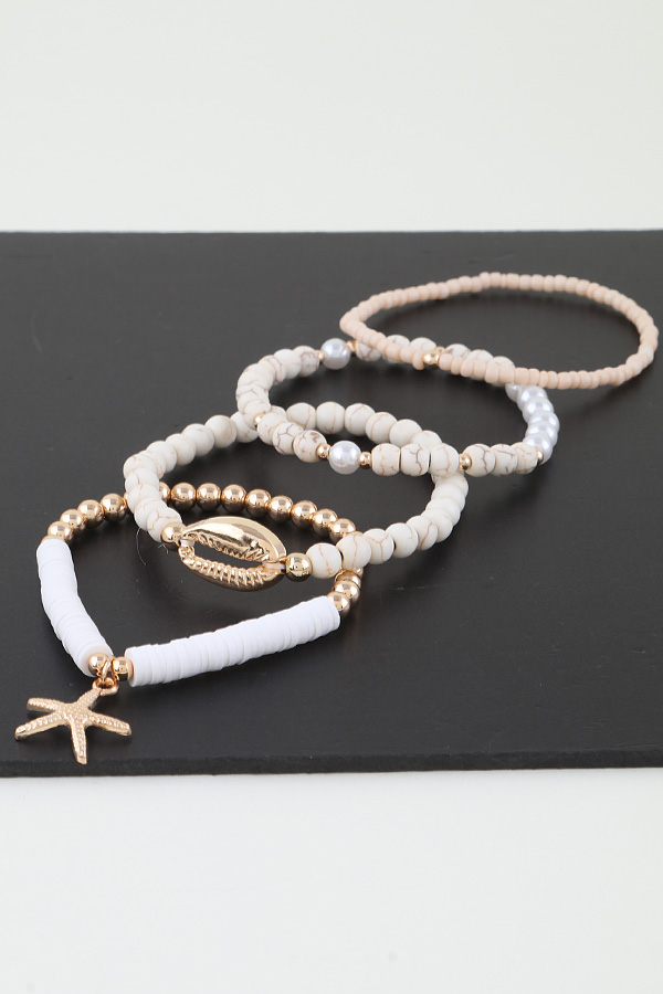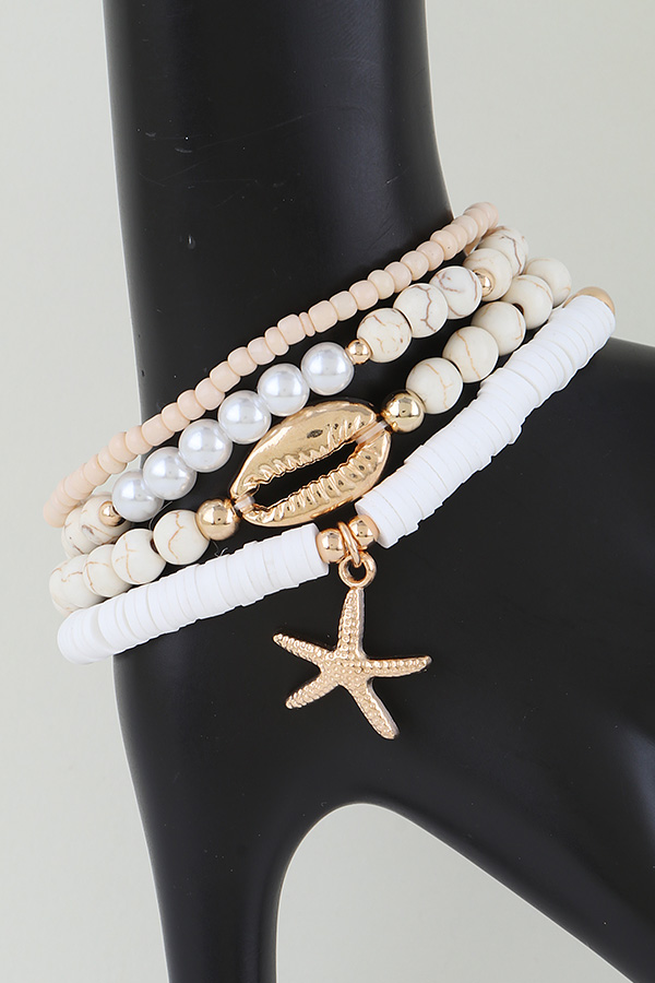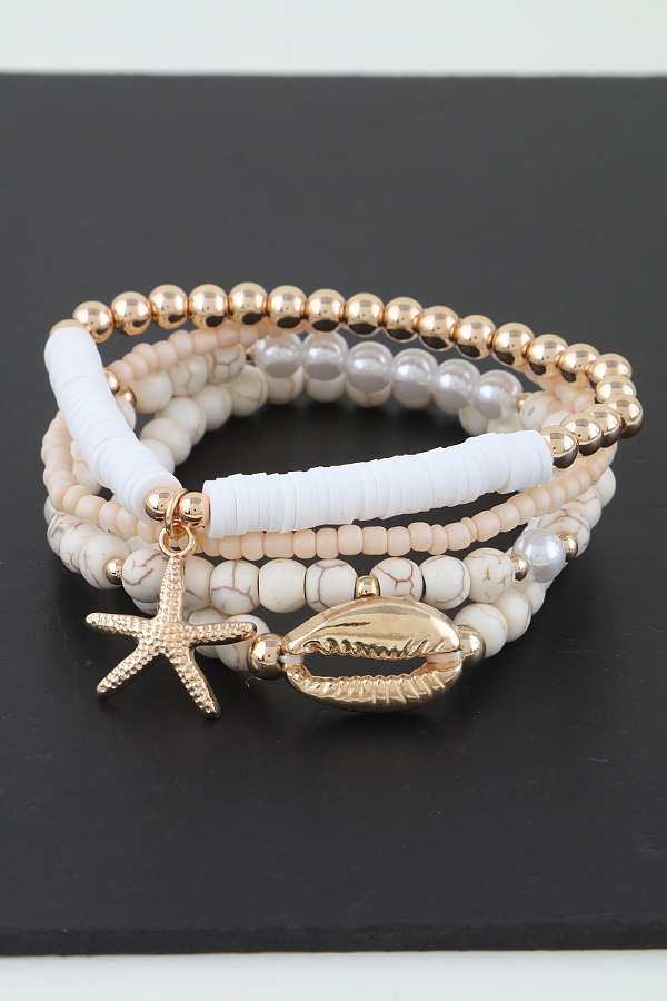 - * This Multi Sea Marble Charm Bracelet from H&D Accessories is a captivating accessory that exudes coastal charm. It features a layered design with a combination of white marble - like beads, lustrous pearls, and small, smooth beige beads. Golden - toned elements, including a detailed shell charm and a starfish pendant, add a touch of elegance and a nautical theme. The white cord - like bracelet completes the look, creating a stylish and beach - inspired ensemble.