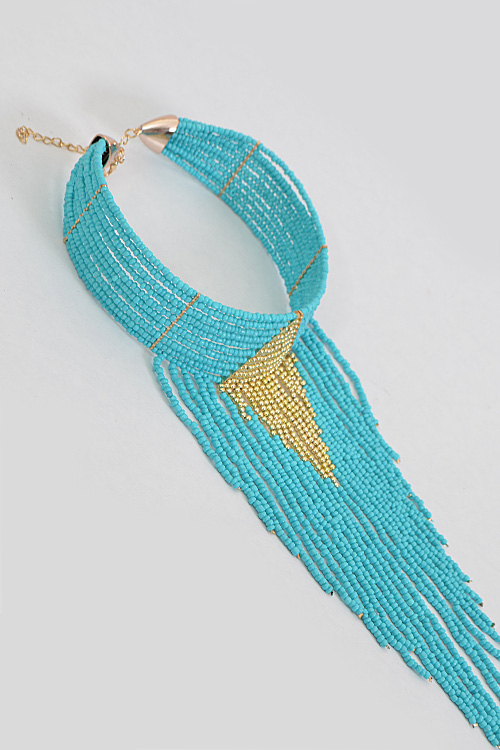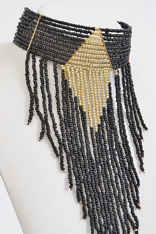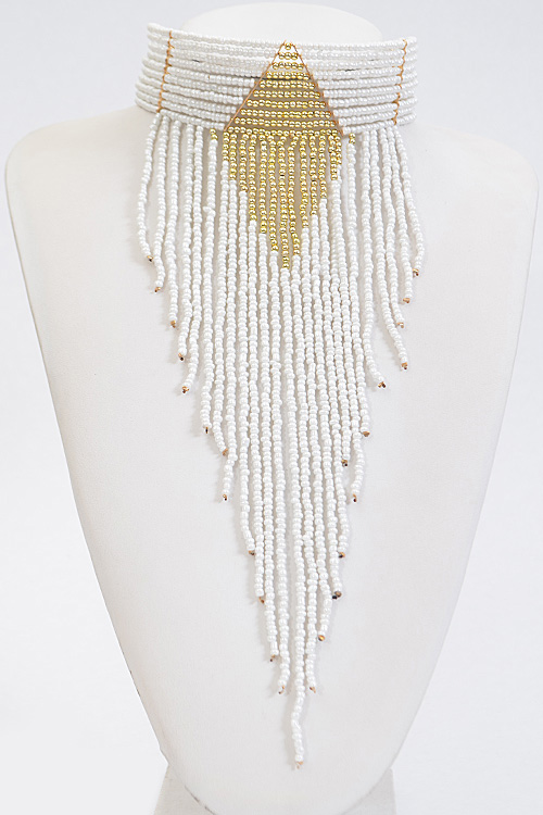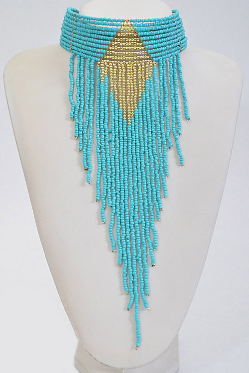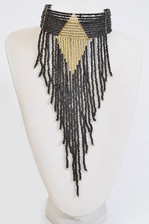- * Beaded Choker Like Long Fringed Statement Necklace * 4.5 x 4.5 x 11" approx.