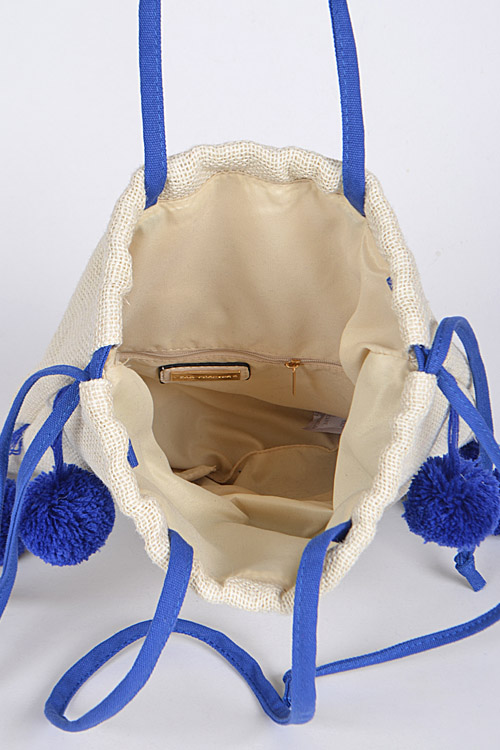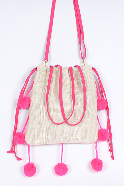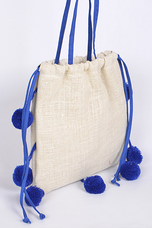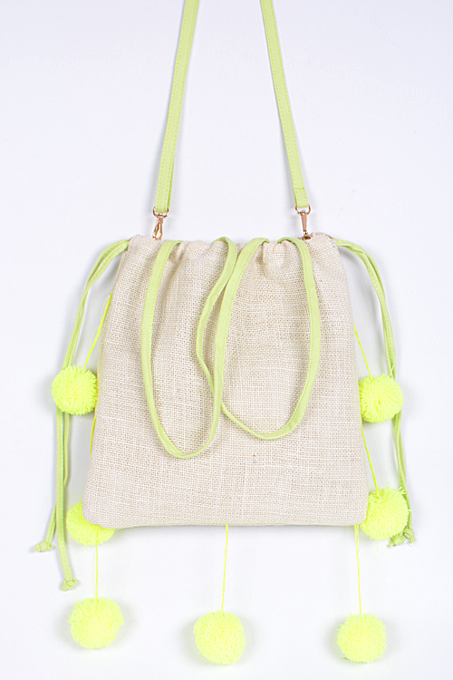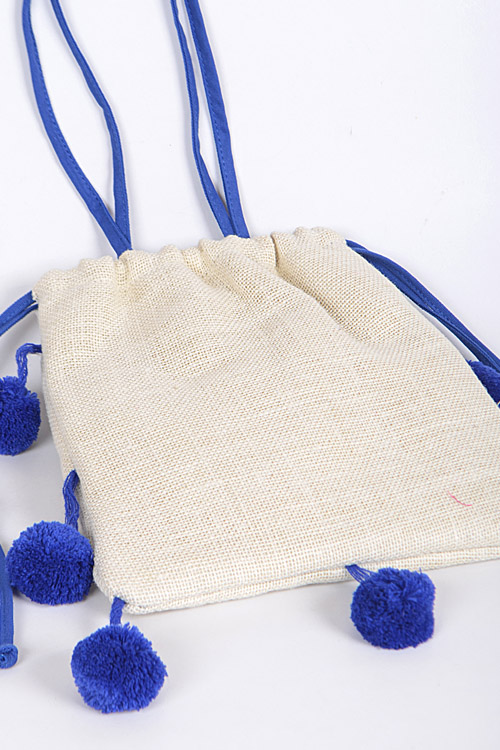 - * Hippie Style Clutch With Puff Balls * 12W*12.5H*0.5D * Polyurethane, Linen