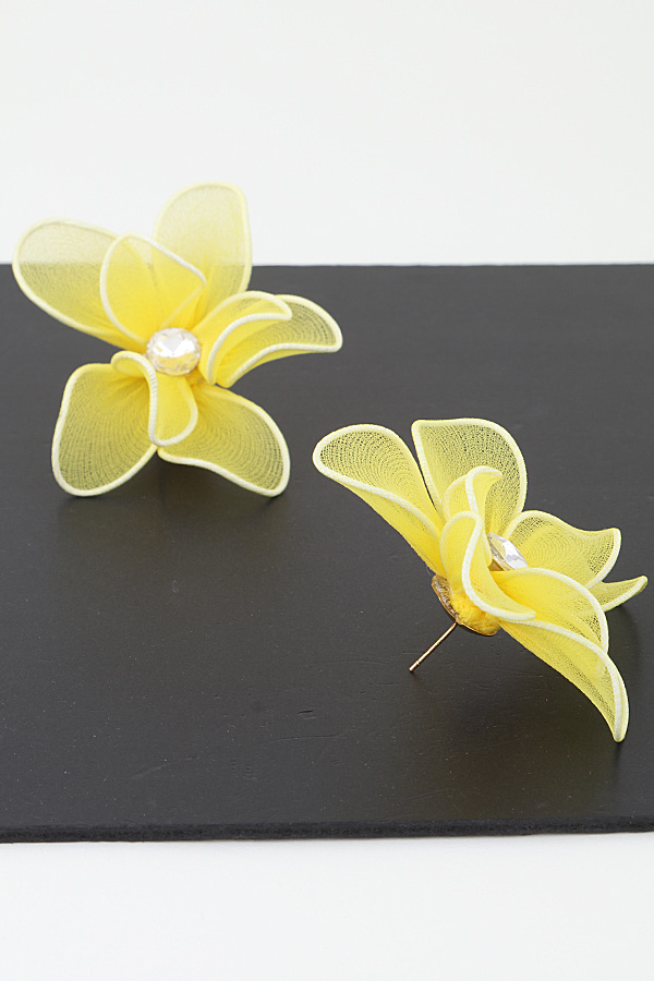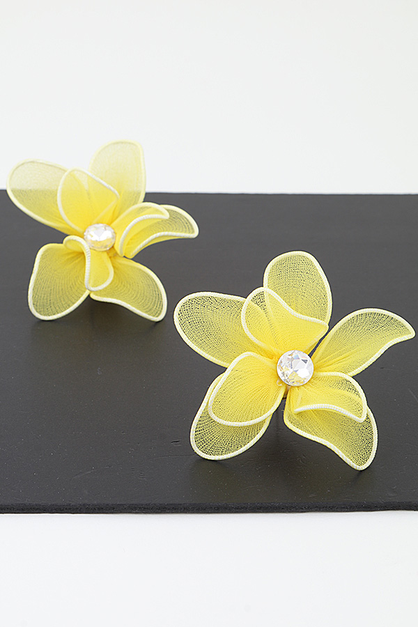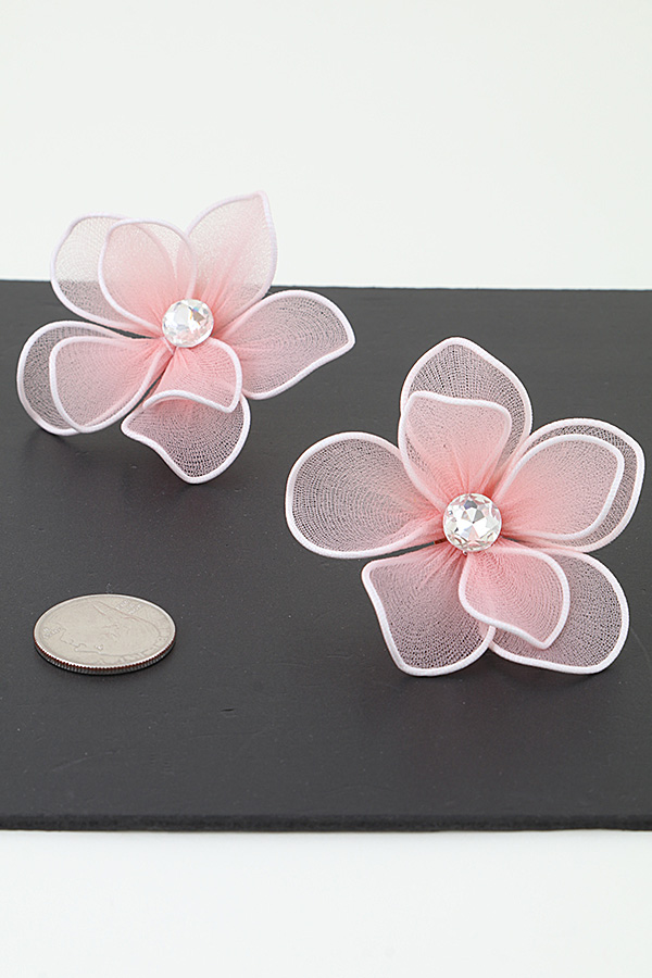 - * These Crystal Blossom Flower Stud Earrings from H&D Accessories feature delicate, layered petal designs made with lightweight, sheer fabric, centered with a single shimmering crystal for a subtle glow. Their soft, three-dimensional shape adds a romantic touch to any lookâperfect for accenting a flowy dress during a weekend brunch, or bringing a gentle, feminine detail to evening cocktail attire, blending airy texture with understated sparkle.