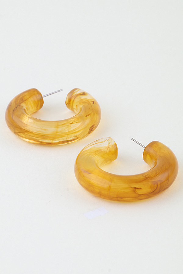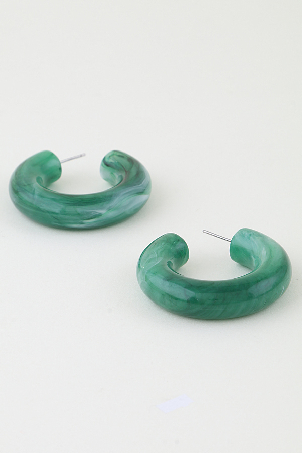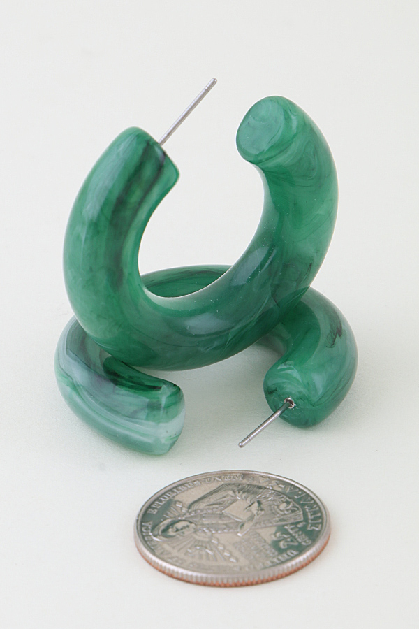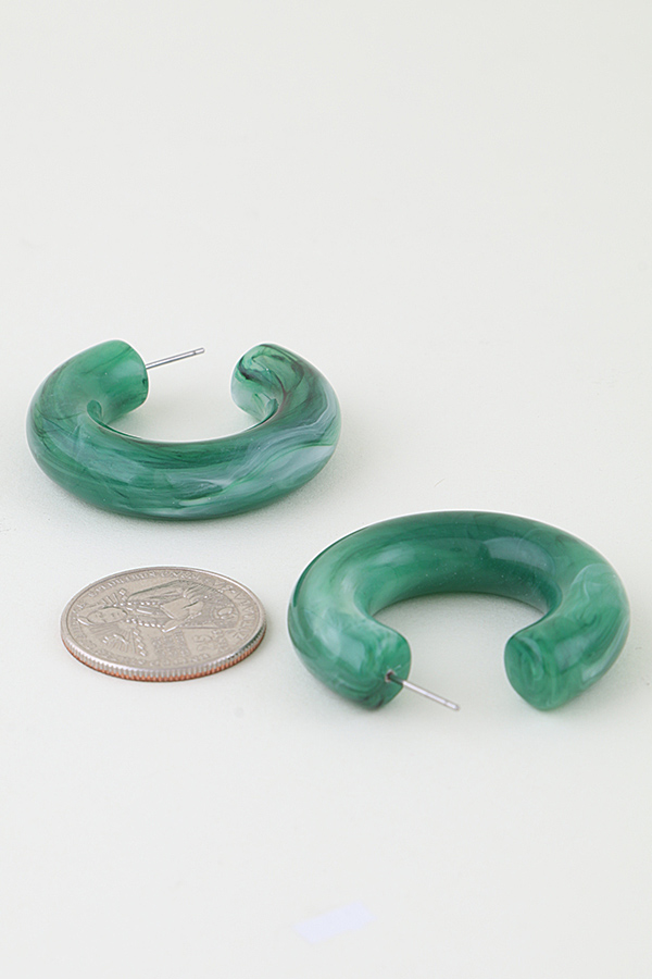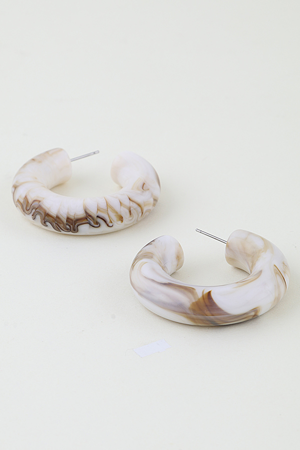 - * These Marble Stone Hoop Earrings from H&D Accessories feature a thick, rounded hoop silhouette crafted with a swirling, organic marble-like pattern. The smooth, polished surface highlights the natural, fluid texture of the material, while the open hoop design maintains a lightweight feel. Equipped with a secure post-back closure, the earrings blend bold, statement-making shape with the subtle, natural variation of the marble-inspired finish, creating a modern, eye-catching accessory.