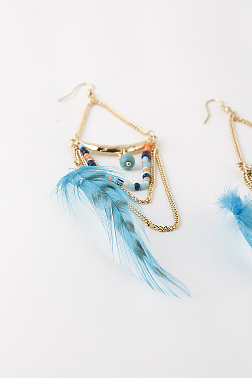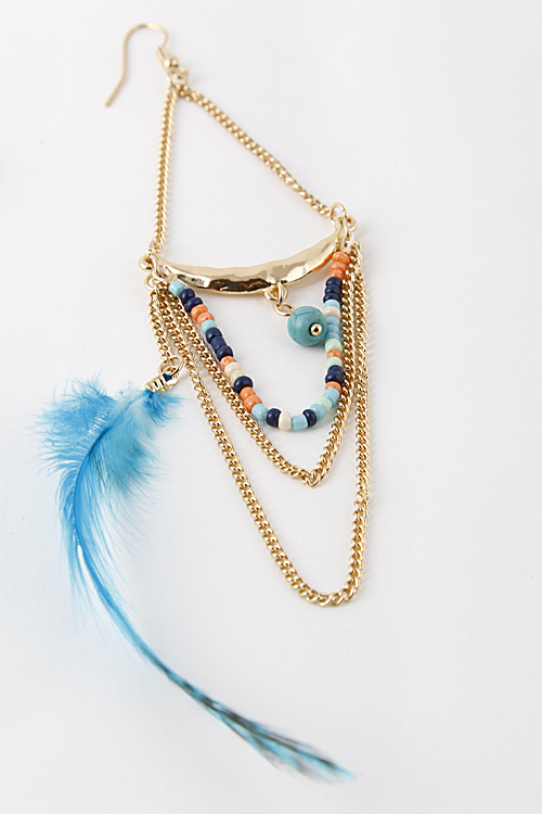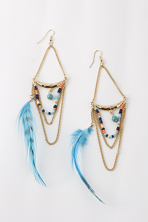 - * Blue Feather Bead Chain Draped Earring 5FBH2 * 1.5 x 7" approx.