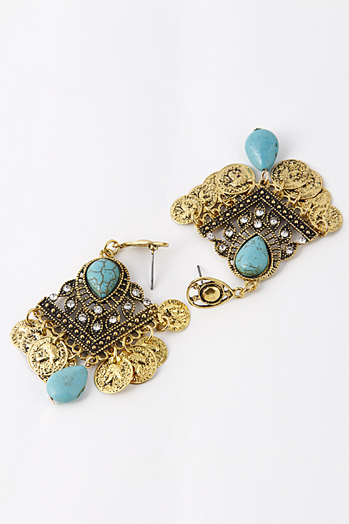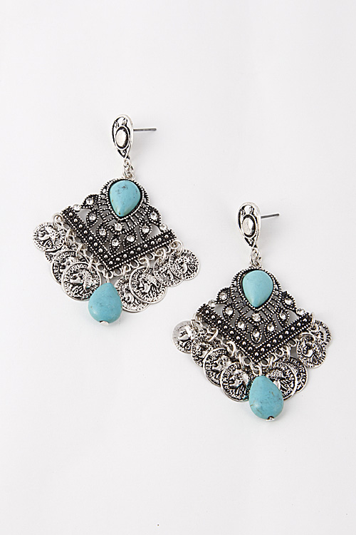 - * Teardrop Turquoise Stone Coin Dangle Earring 5FBH2 * 2 x 3" approx.