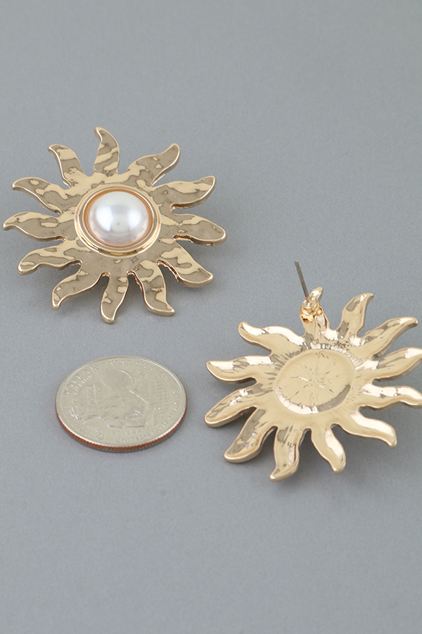 • * Make a bold statement with these Rising Sun Pearl Stud Earrings from H&D Accessories. Each earring features a striking sunburst-inspired metal frame, with a lustrous pearl at its center that mimics the glow of a rising sun. The textured, slightly distressed finish adds a vintage-inspired charm, while the stud design ensures a secure and comfortable fit. Perfect for elevating any ensemble, these earrings blend celestial allure with timeless elegance, making them a standout addition to your jewelry collection.