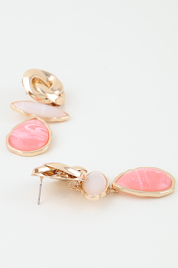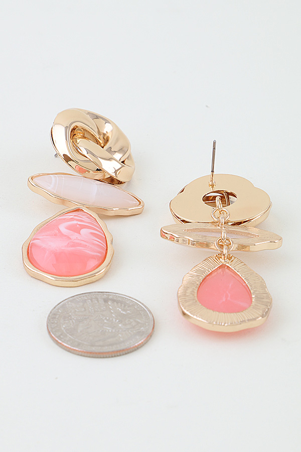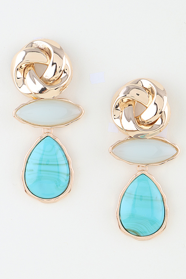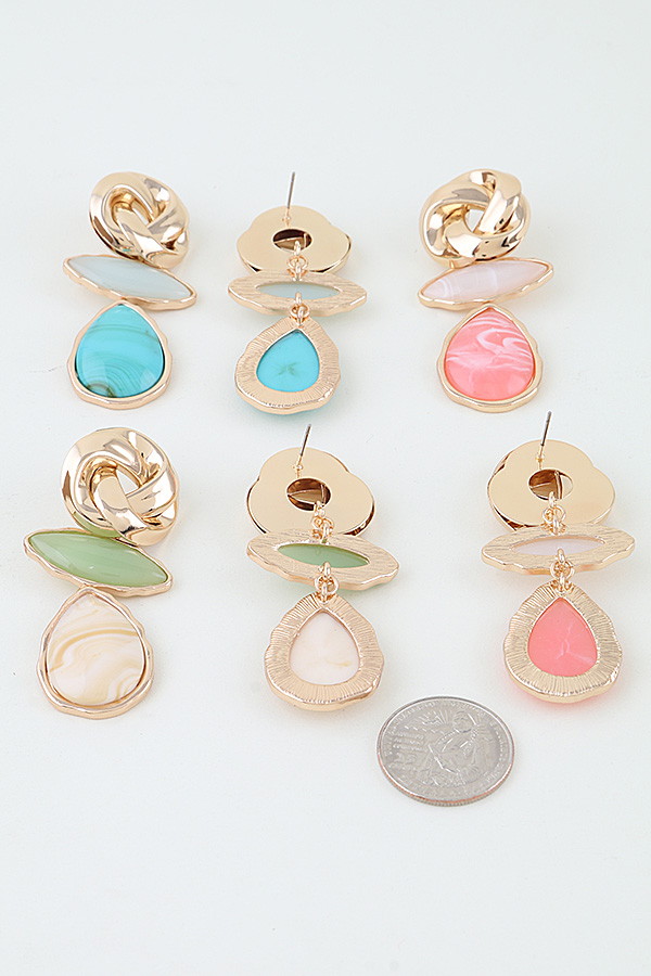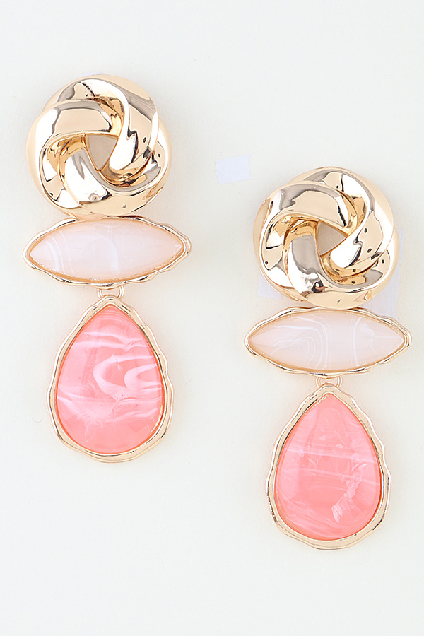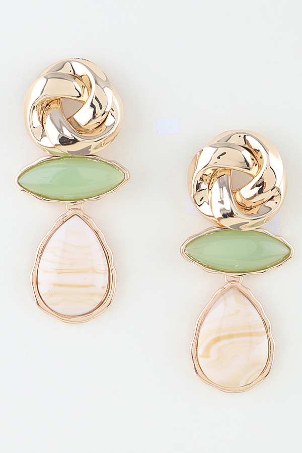 • * Modern Marble Stone Knot Earrings from H&D Accessories boast an elegant tiered structure, starting with a polished interwoven metal knot top that adds a sophisticated tactile dimension, connected to a sleek marquise-shaped marble stone and finished with a lustrous teardrop-shaped stone with delicate veining details, creating a refined and modern look ideal for accessorizing office wear, evening dinners, and special celebration outfits.