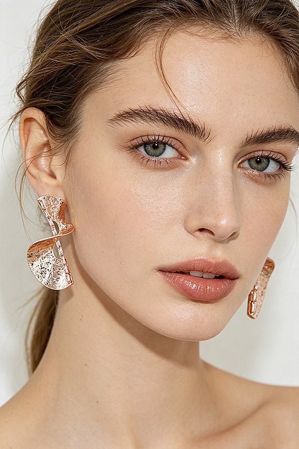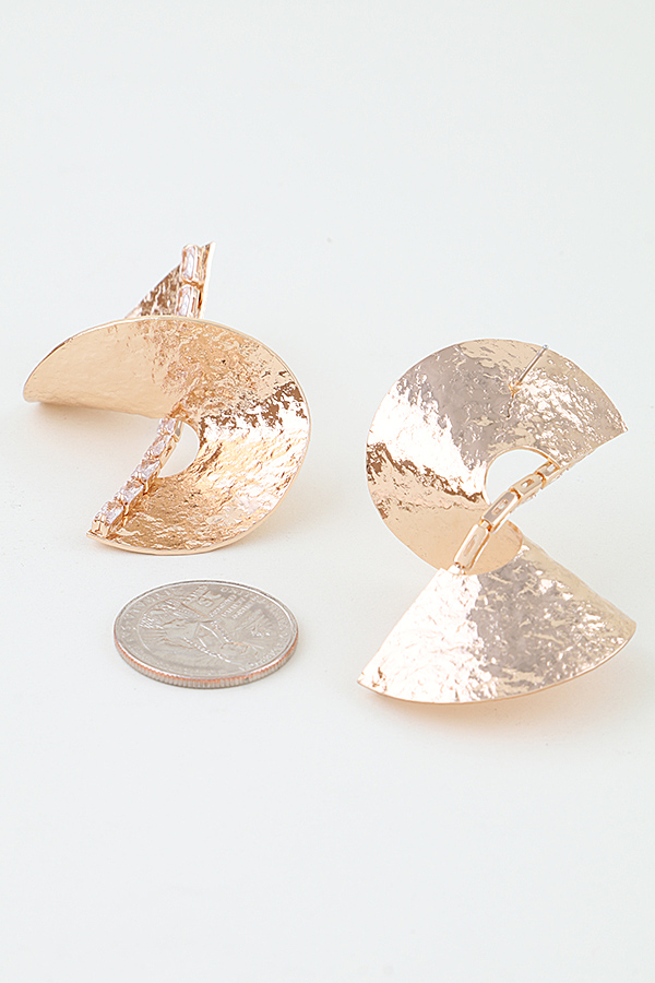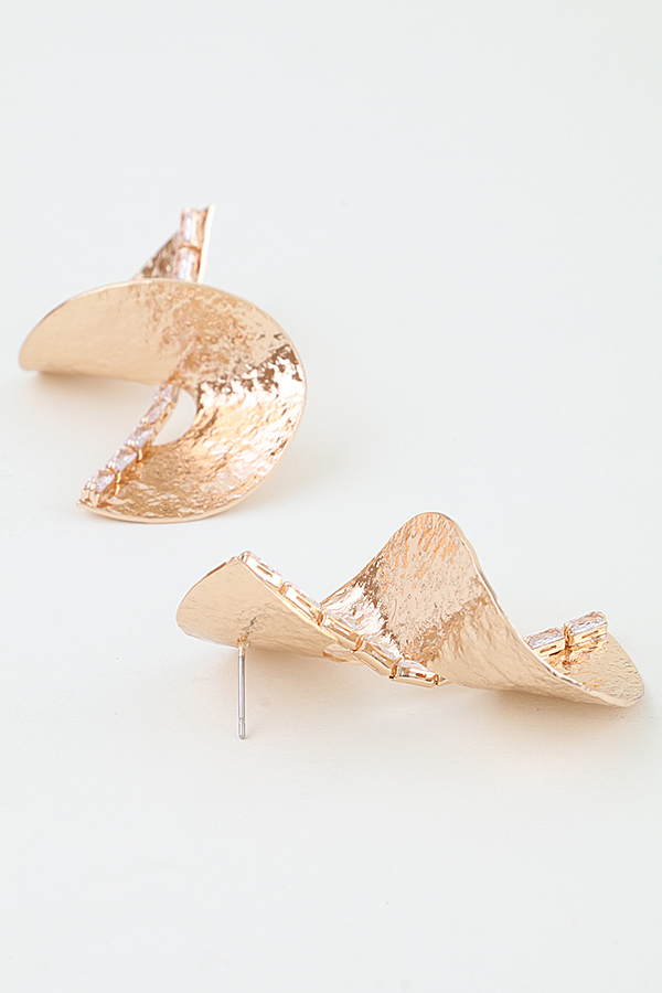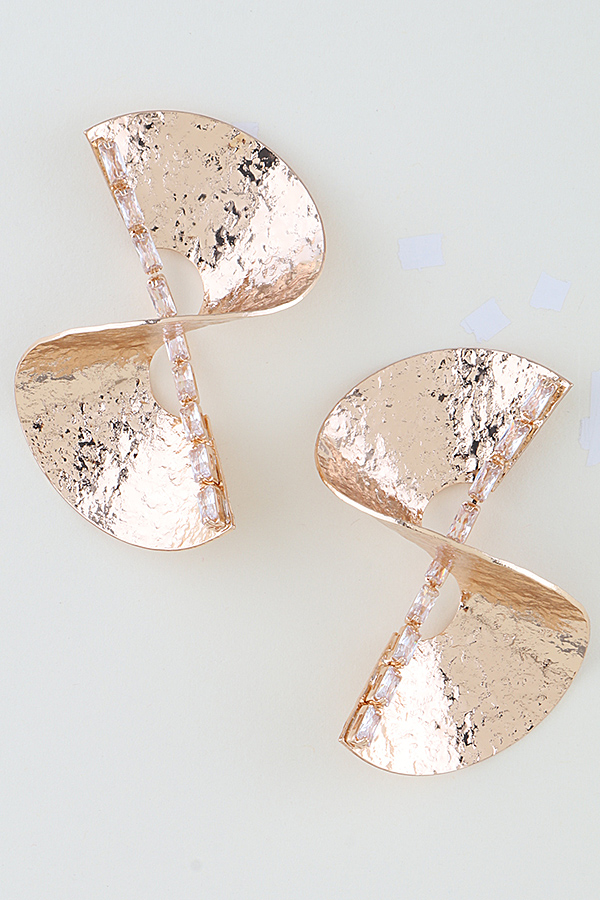 - * These Hammered Ripple Swirl Drop Earrings from H&D Accessories feature an avant-garde double swirl silhouette crafted from polished gold-toned metal with a intricate hammered ripple texture across the curved surface, accented by a linear row of sparkling baguette-cut stones running vertically through the twist for a luminous, eye-catching detail, designed with a secure post-back closure for comfortable all-day wear, perfect for elevating formal events, evening soirees, or bold daytime looks to make a striking, modern fashion statement.