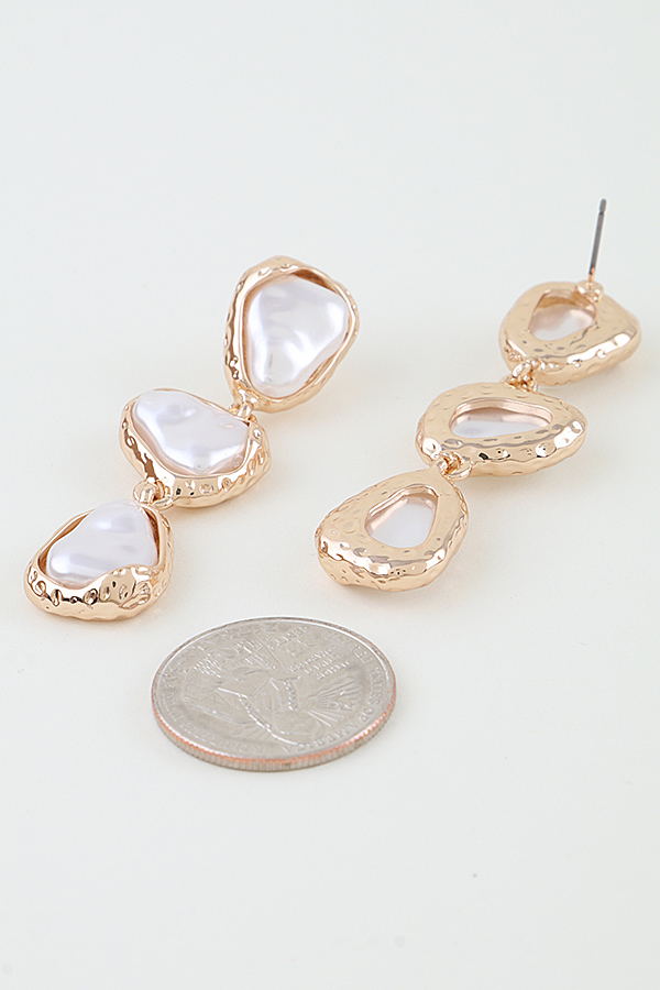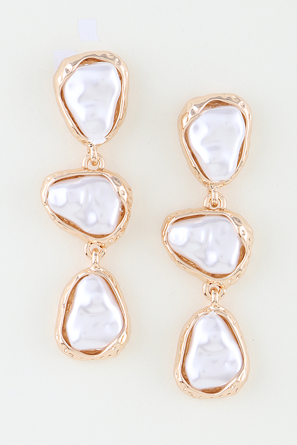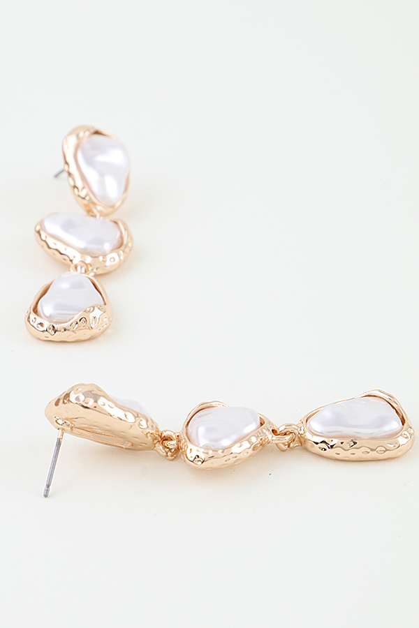 - * These drop earrings from H&D Accessories feature a vertical trio of irregular, lustrous pearl-like stones, each set within a textured, hammered metal frame. The organic, uneven shapes of the stones and frames create a modern, artisanal look. Suspended in a cascading design, they deliver a bold, dimensional silhouette that adds a sophisticated, statement-making touch to any look.