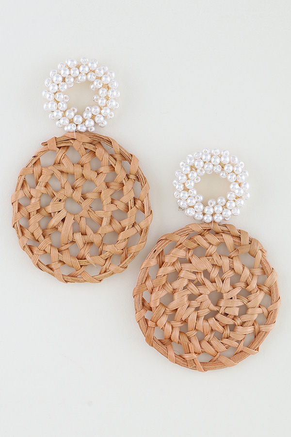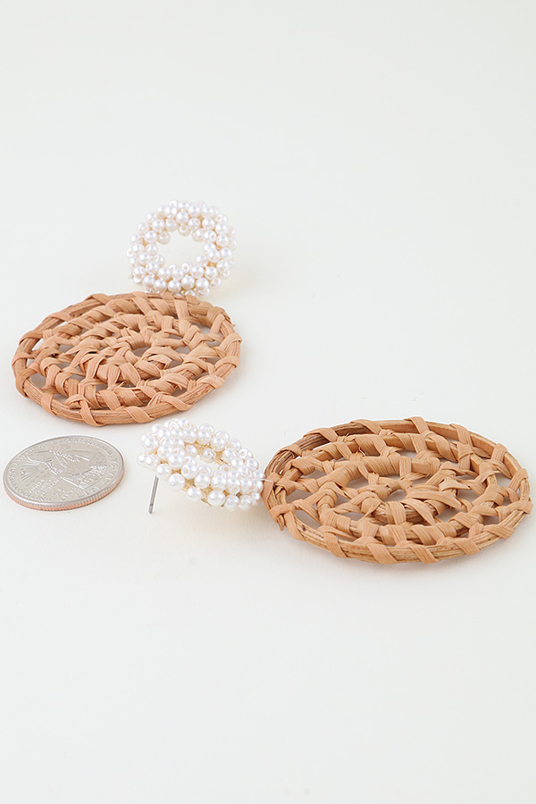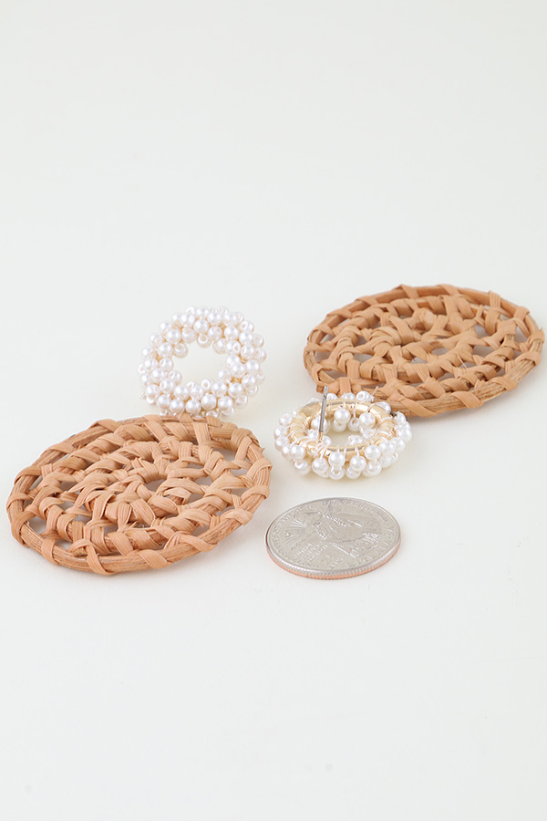 • * This is a pair of Basket Weaved Disc Earrings from H&D Accessories. Each earring has a two - part structure: a circular pearl - adorned top piece and a larger, basket - weaved disc below. The basket - weaving creates an intricate, textured pattern, giving the earrings a unique and artisanal look.