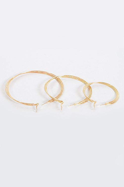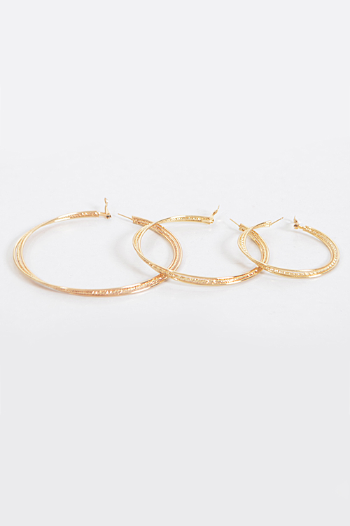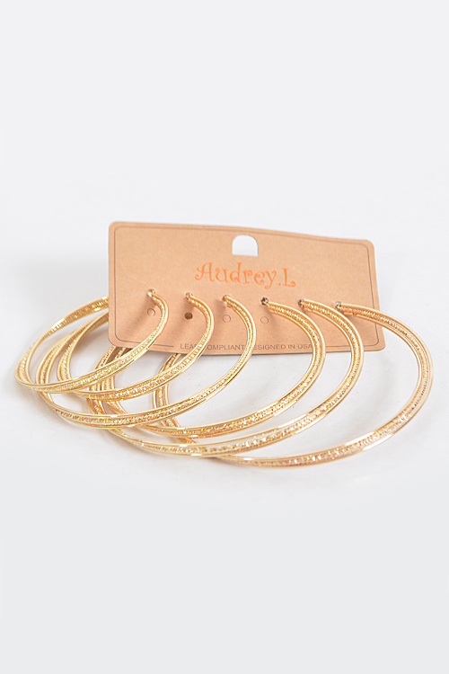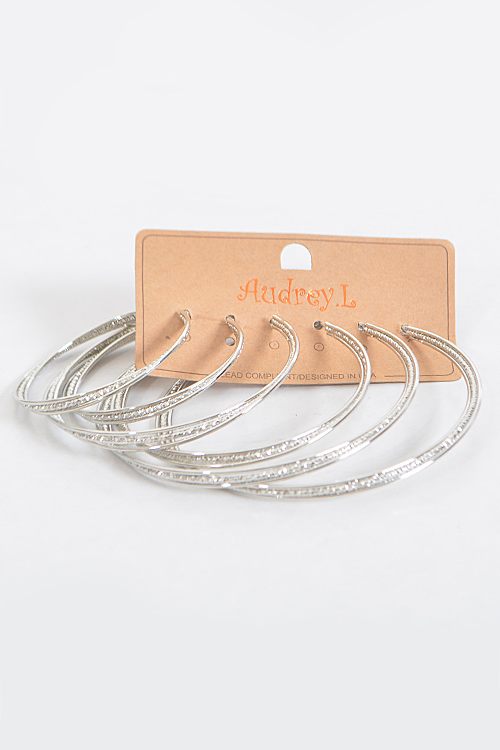 - * Multi Layered Glitter Hoop Earrings Set * 2.5 x 2.5" approx. * 3.25 x 3.25" approx. * 4 x 4" approx.