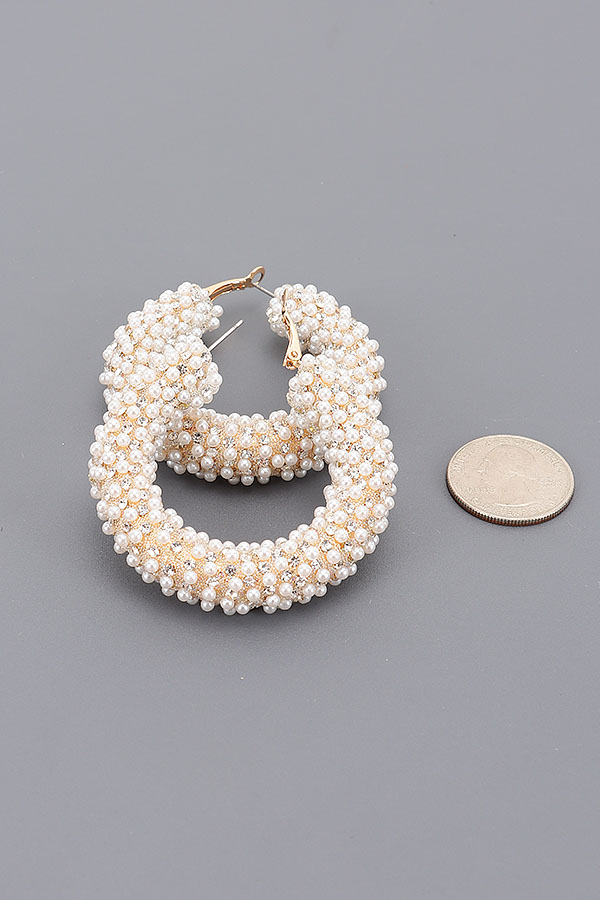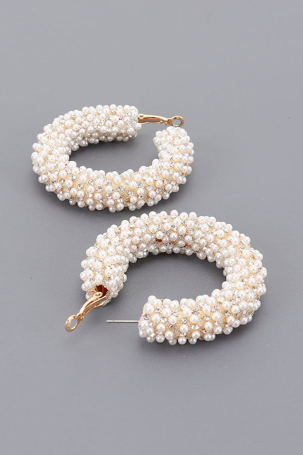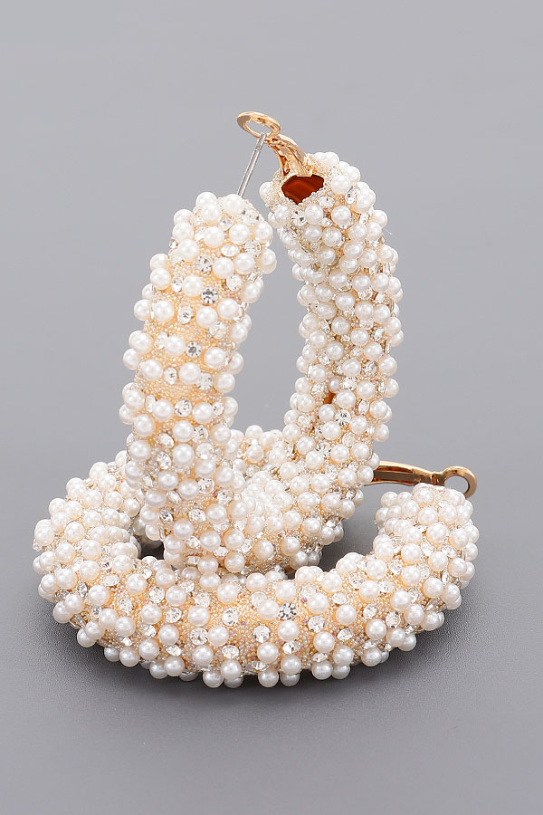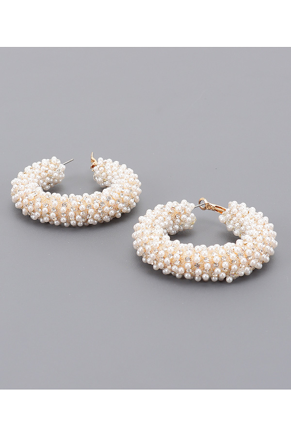 - * These Beaded Pearl Hoop Earrings from H&D Accessories feature a lavish design. Each earring is a large hoop densely covered with small pearls, creating an opulent and eye-catching look. The pearls are meticulously arranged to form a continuous, elegant circle, with metal components adding structural support.