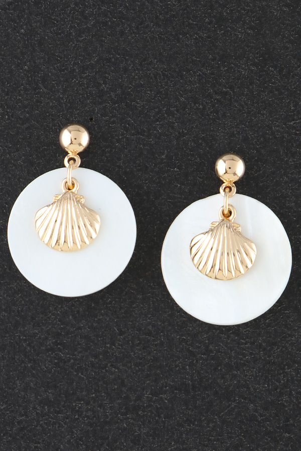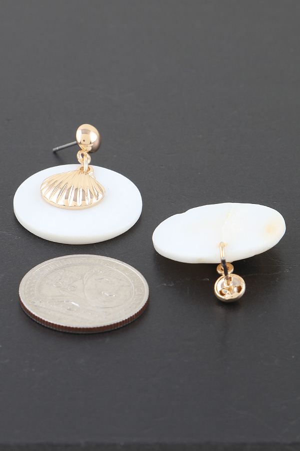 - * These Clam Shell Disc Drop Earrings from H&D Accessories are a stylish and elegant choice. They feature large, white disc - shaped elements that resemble shells, giving a natural and serene aesthetic. Suspended from the discs are intricately detailed gold - toned clam shell charms, adding a touch of sophistication and a nautical flair. The earrings are finished with a small gold ball at the top for easy wearing.