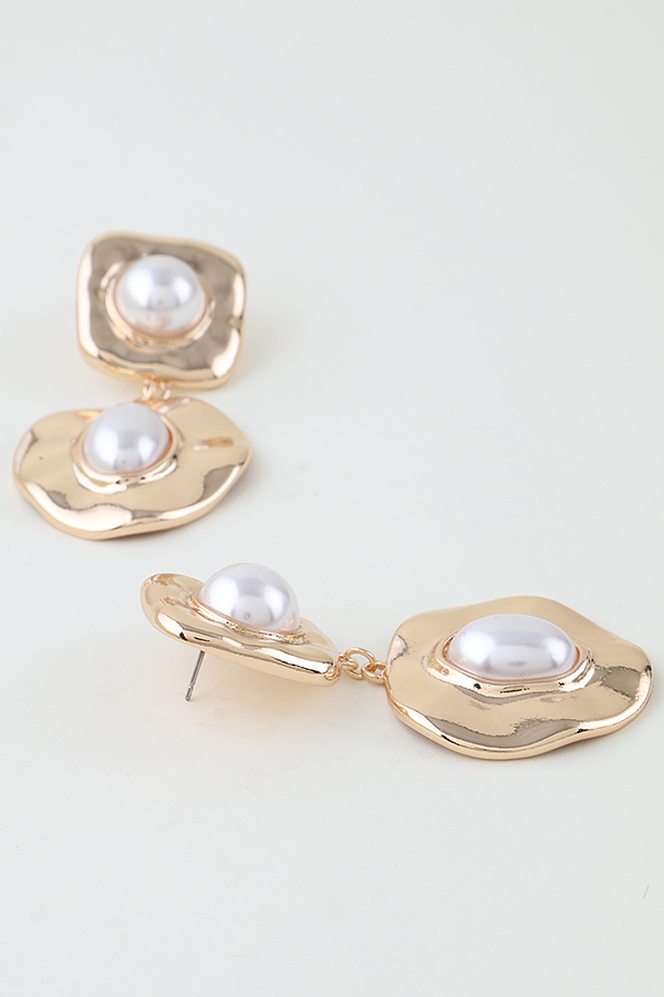 - * Hammered Gold Pearl Abstract Earrings (From H&D Accessories) feature a two-tiered silhouette: a structured geometric top piece paired with an organic, irregular lower element, each centered with a lustrous pearl. The metal surfaces boast a textured, hand-hammered finish that adds artisanal depth and dimensionality. Designed with delicate chain links between tiers, these earrings blend modern abstract shapes with timeless pearl elegance,