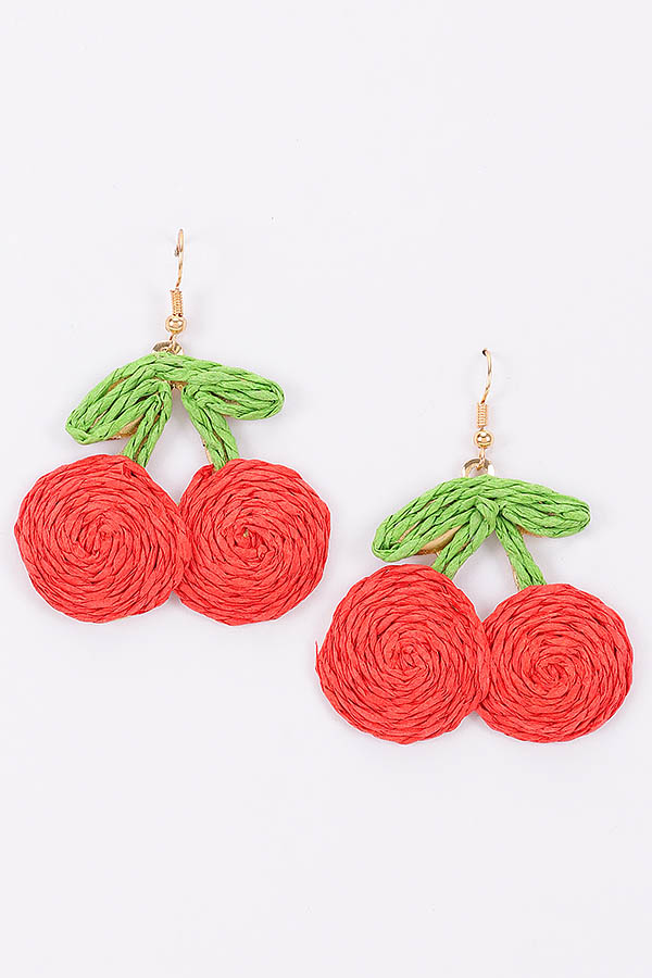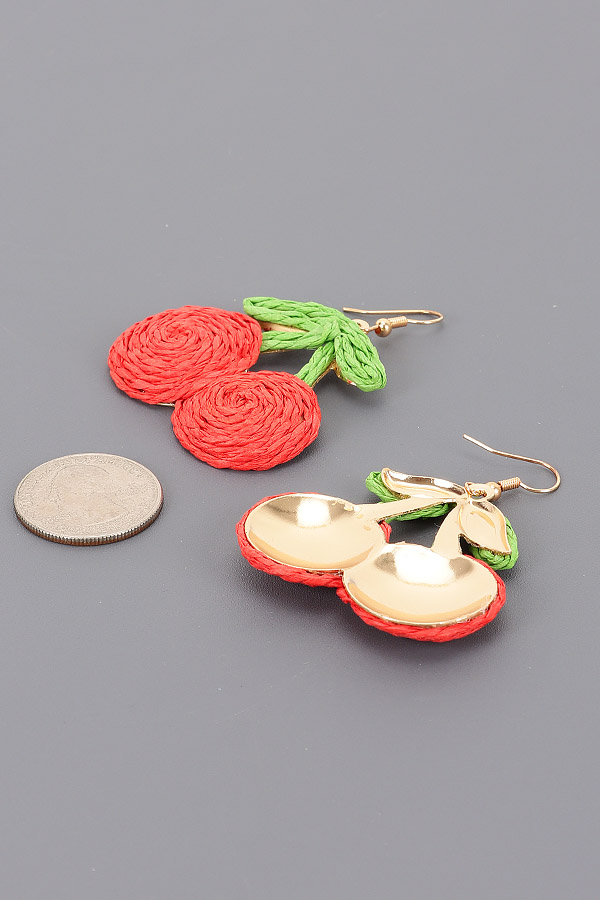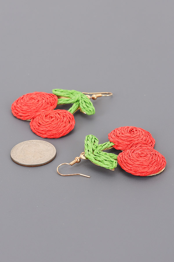 • * These are Faux Straw Earrings. From H&D Accessories, they are crafted into a cute cherry shape, with detailed textures that give them a vivid and playful look. The earrings feature two rounded elements resembling cherry fruits, connected by green - textured parts mimicking leaves, and hang from delicate hooks. They are perfect for adding a touch of fun and charm to your outfit when you're going to a summer picnic or a casual brunch with friends, effortlessly bringing a lively and youthful vibe to your overall style.