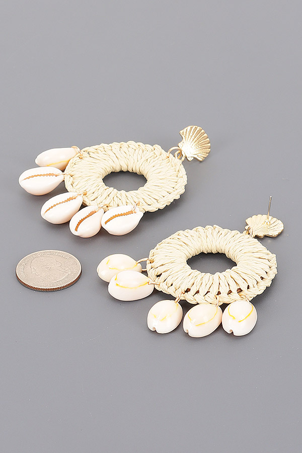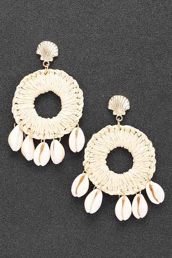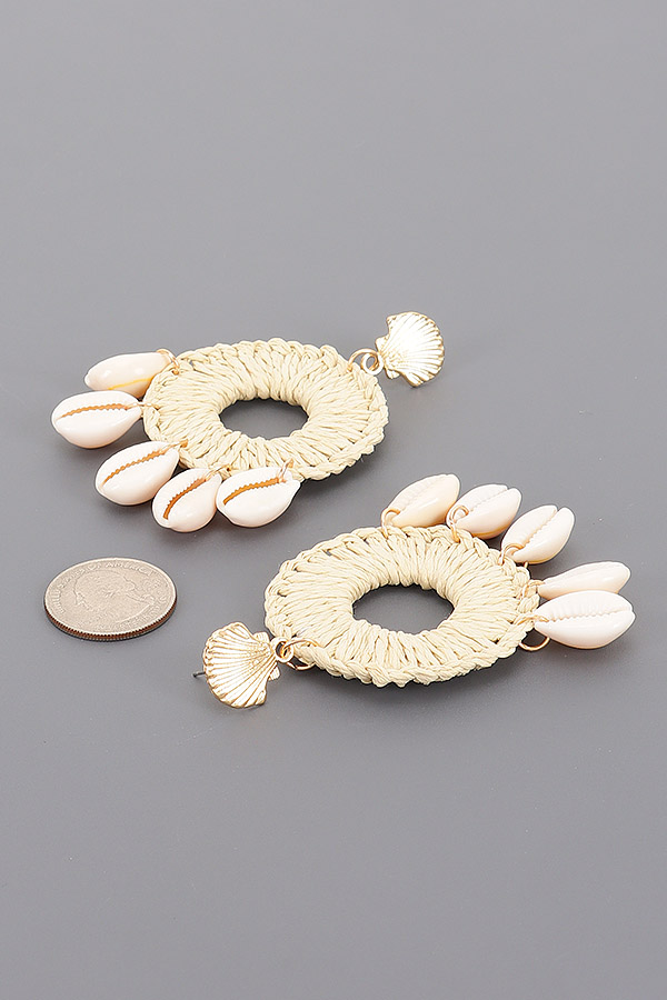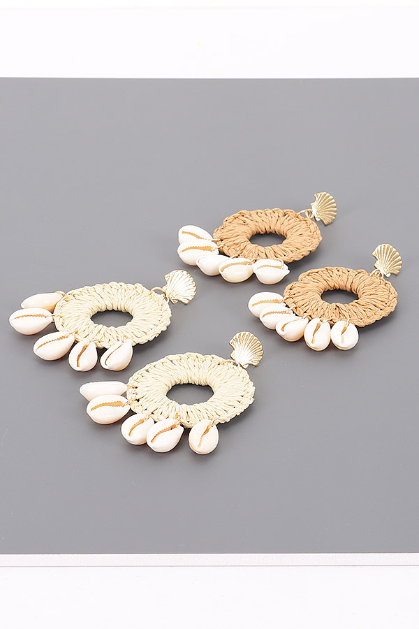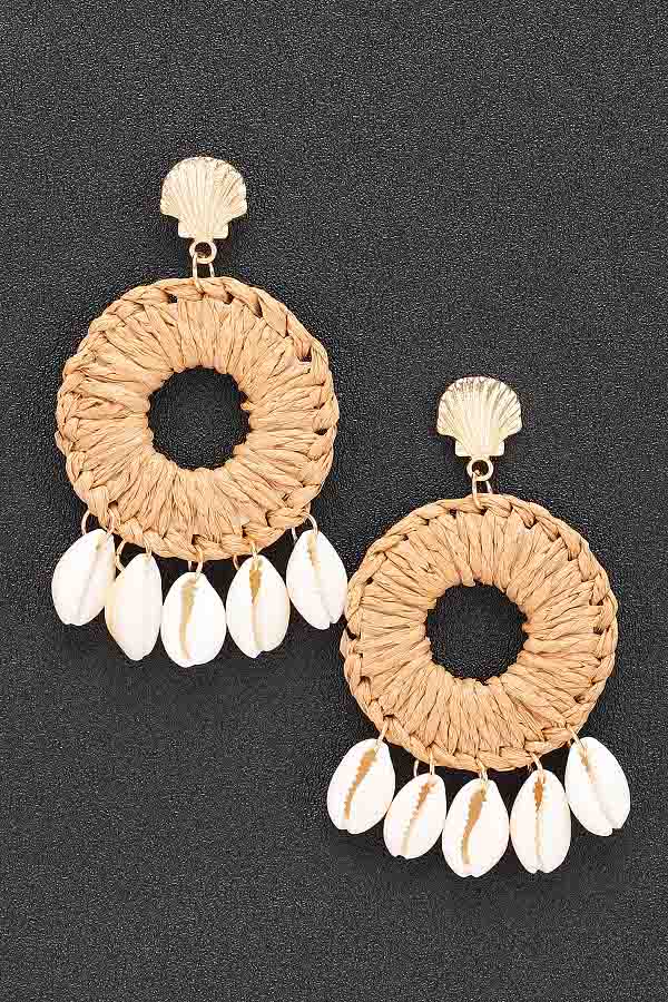 - * This Faux Straw Earring from H&D Accessories features a design with a circular faux straw element, adorned with shell - shaped accents and dangling shell details. It has a beachy and stylish appearance, giving off a trendy and coastal vibe.Ideal for complementing outfits during beach outings, whether lounging by the shore or taking a stroll along the beach, matching the seaside atmosphere.