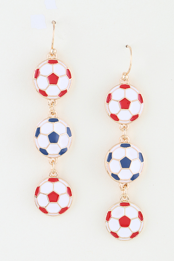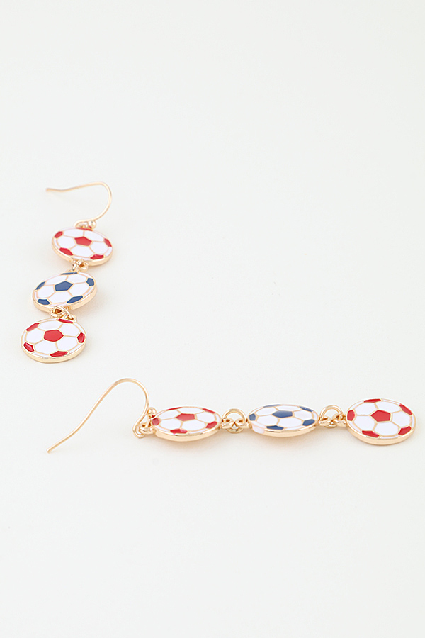 - * These Soccer Ball Drop Earrings from H&D Accessories feature a vertical dangle design with three stacked soccer ball charms, each detailed with classic paneled patterns and outlined with a polished metal finish, connected by delicate chain links to slender hook fastenings, with a lightweight construction that ensures comfortable wear, making them ideal for game days or sporty casual outings.