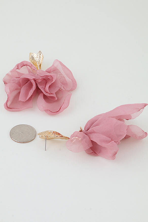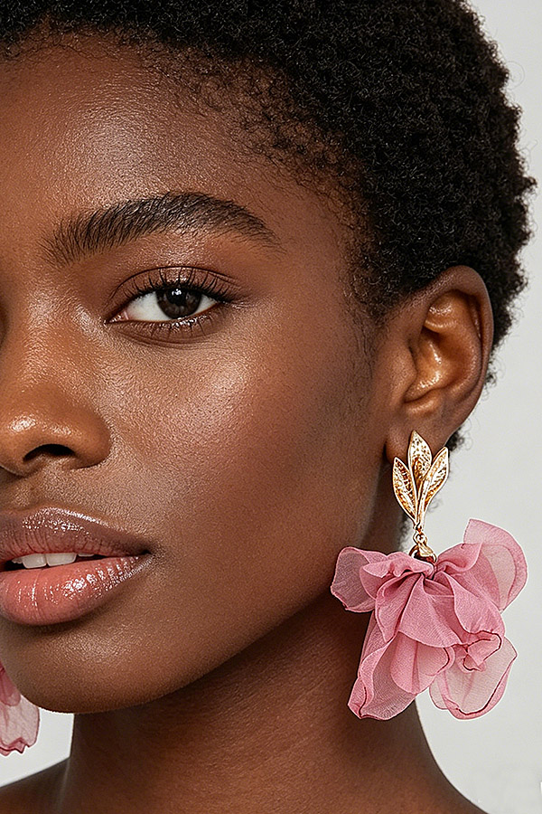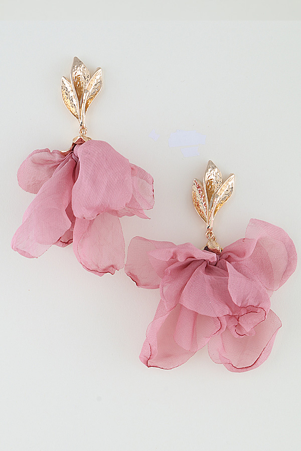 - * These Blossoming Rose Drop Earrings from H&D Accessories feature a textured, three-leaf stud top with a hammered finish, suspending a voluminous, layered fabric rose bloom that creates a soft, romantic, dimensional silhouette, lightweight for comfortable all-day wear, perfect for elevating spring weddings, garden parties, or feminine daytime looks.
