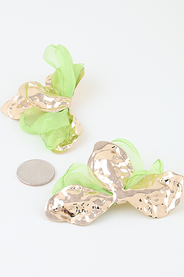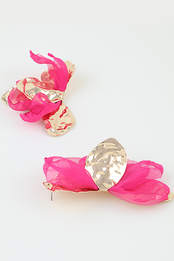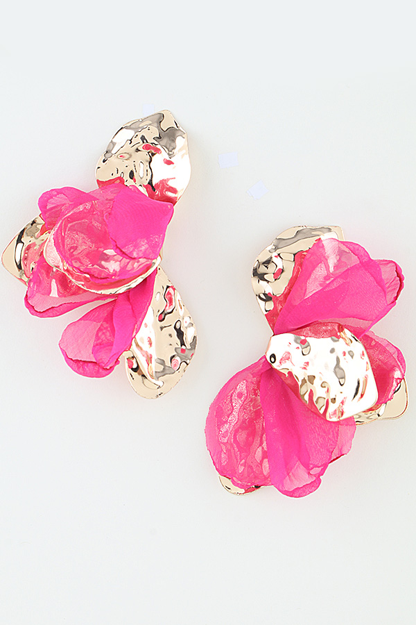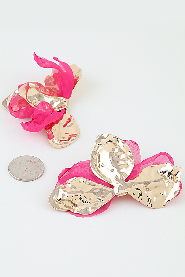 • * These Hammered Fabric Petal Blossom Earrings from H&D Accessories feature a layered floral silhouette with textured hammered metal petals paired with soft, sheer fabric petals that create a delicate, airy contrast, crafted with a lightweight structure that ensures comfortable all-day wear, making them ideal for adding a bold, romantic touch to daytime outings or special evening occasions.