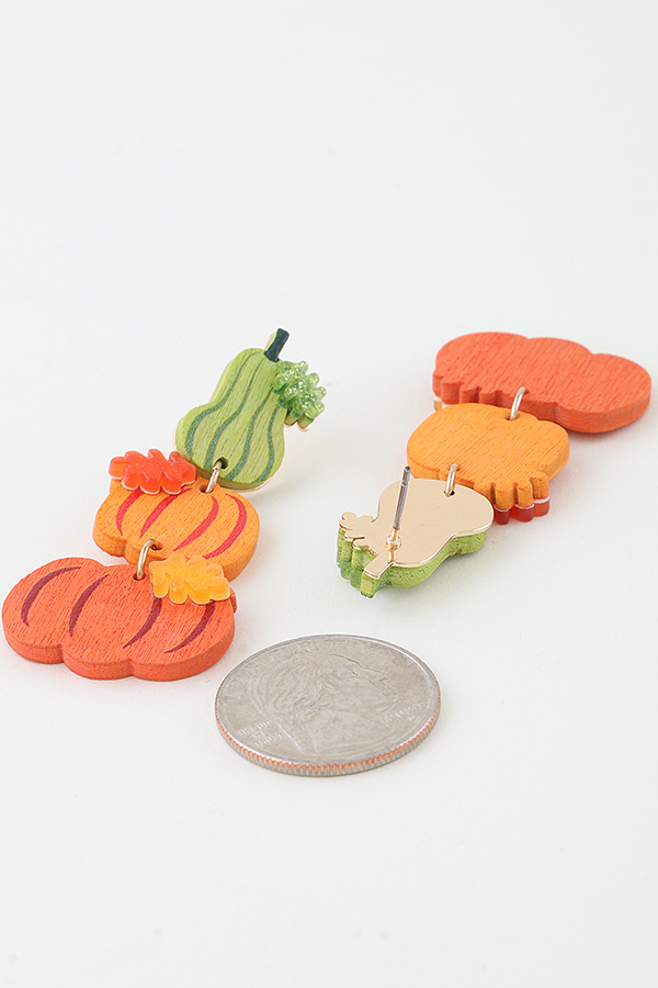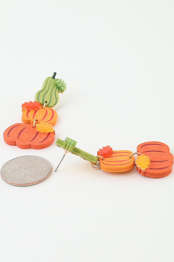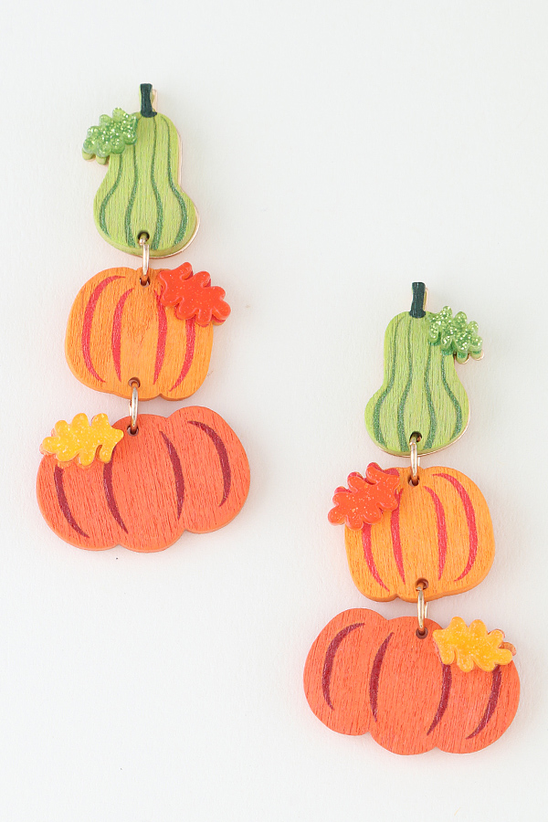 - * Triple Pumpkin Holiday Earrings from H&D Accessories are exquisitely designed. They feature three stacked pumpkins with a gourd on top, each adorned with small leaves, creating a festive and charming look. These earrings are crafted with meticulous attention to detail, making them a delightful accessory for autumn and holiday celebrations. They are lightweight and comfortable to wear, perfect for enhancing your seasonal style.