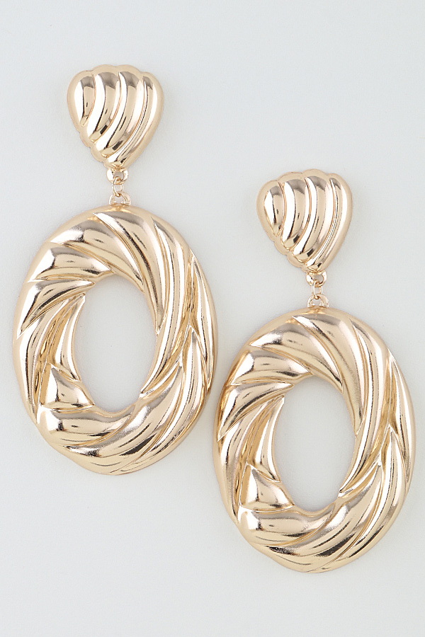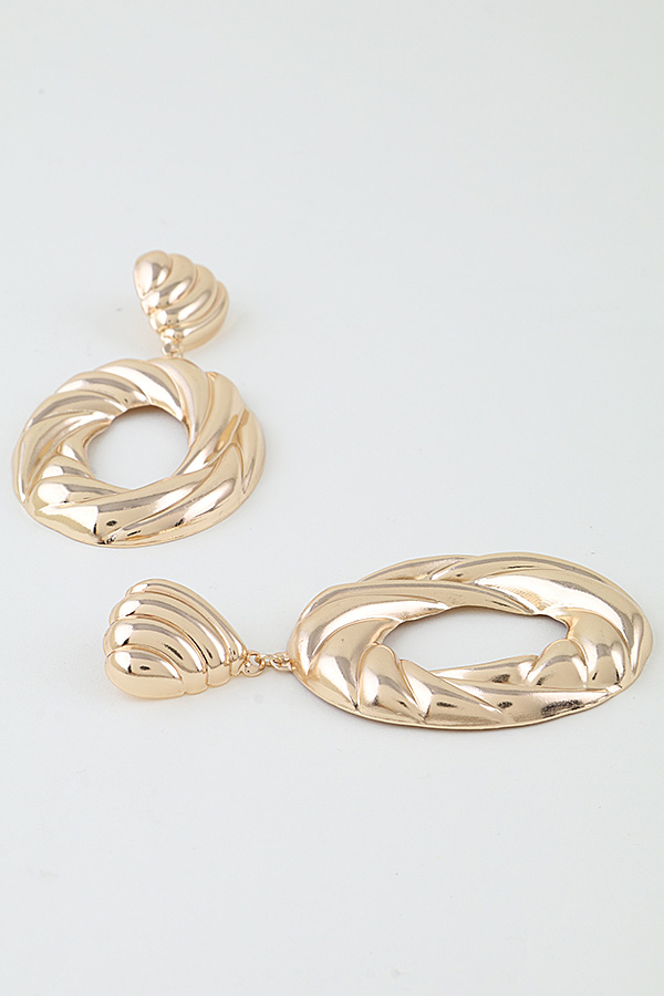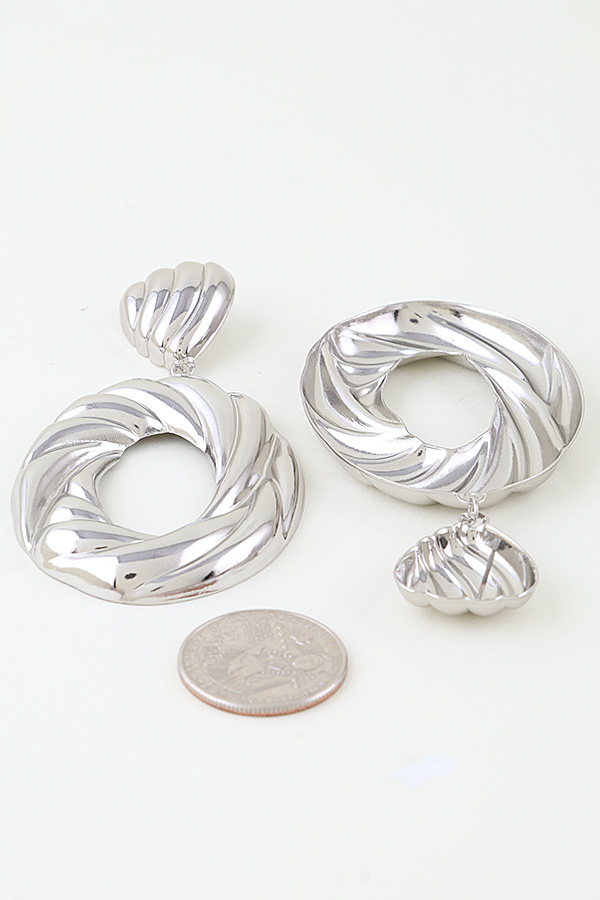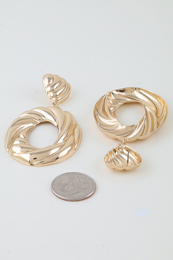 • * These Chic Twisted Disc Drop Earrings from H&D Accessories feature a layered design: a small, ribbed top piece connects to a large, oval open disc with a textured twisted pattern. The swirling, sculpted detail of the disc adds dimensional depth, while the polished finish enhances its sleek, bold silhouette. Lightweight despite the statement size, the earrings merge organic, fluid texture with modern geometric shape, creating a distinctive piece that balances artistic detail with contemporary charm.