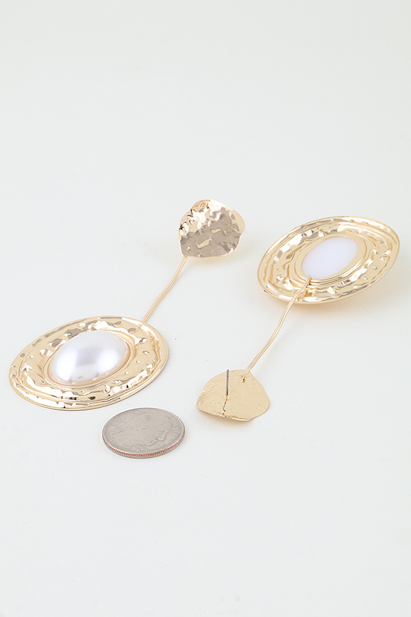 - * These Modern Hammered Pearl Drop Earrings from H&D Accessories feature a distinctive design with hammered metal elements and a central pearl. The top section has a textured, hammered circular piece, while the drop part showcases an oval hammered frame with a lustrous pearl at its center. The meticulous craftsmanship is evident in the textured metal finish and the secure setting of the pearl, creating a piece that blends contemporary artistry with classic elegance, making it a unique addition to any jewelry collection.