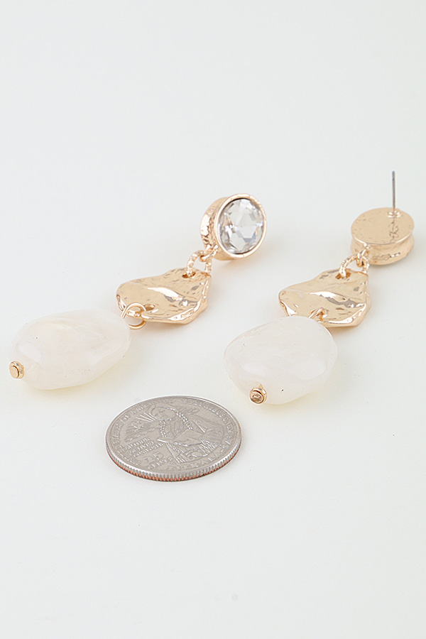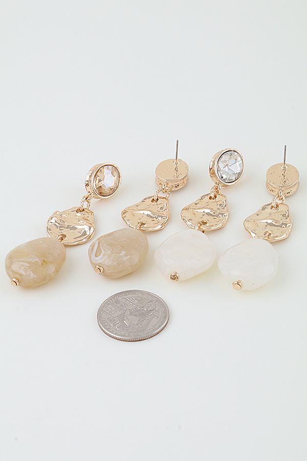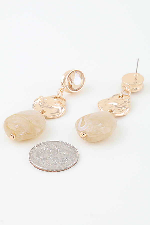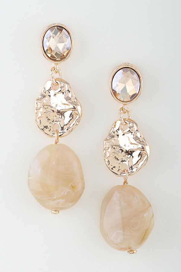 - * This Hammered Crystal Stone Drop Earrings from H&D Accessories feature a layered design: a faceted crystal top, a textured metallic piece, and a smooth, swirled stone drop, creating a balanced mix of shine and subtle texture. The dangling structure adds gentle movement, making them a eye-catching yet refined accessory. They’re perfect for elevating a midi dress for a dinner party, or adding a polished touch to a silk blouse during a evening event, blending elegant details with effortless charm that suits any dressy occasion.