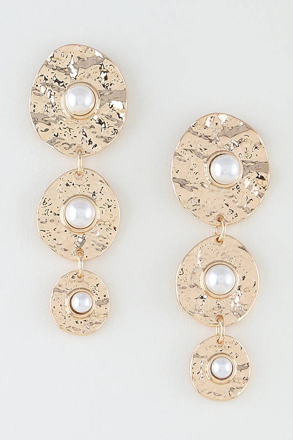 - * These Hammered Pearl Plate Drop Earrings from H&D Accessories feature a layered design of graduated, textured oval plates—each finished with a hammered surface and centered with a smooth pearl. The plates dangle sequentially via delicate connectors, creating a cascading silhouette. The earrings blend artisanal, uneven texture (on the plates) with the soft, luminous finish of the pearls, balancing organic craftsmanship with graceful movement. Lightweight and structured, they offer a modern yet elegant look with subtle dimensionality.