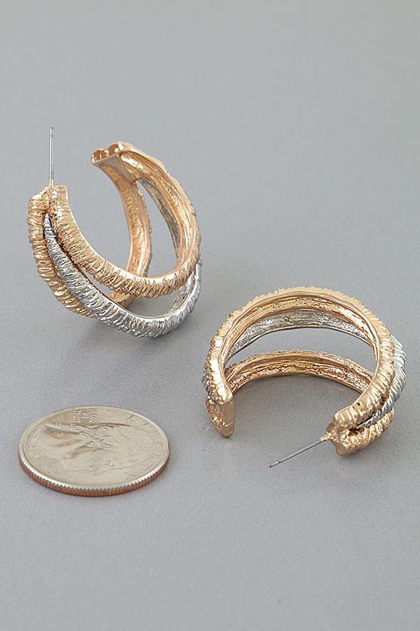 • * These Two Toned Engraved Hoop Earrings from H&D Accessories feature a bold, triple-hoop design with textured, engraved surfaces in polished gold and silver tones, creating a layered, modern silhouette. Their versatile, contemporary style is perfect for adding a polished touch to office attire or making a bold statement at evening outings. Crafted with meticulous detail, they offer both understated sophistication and versatile wearability for any occasion.