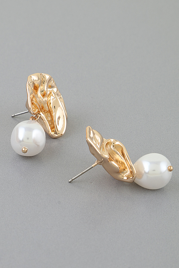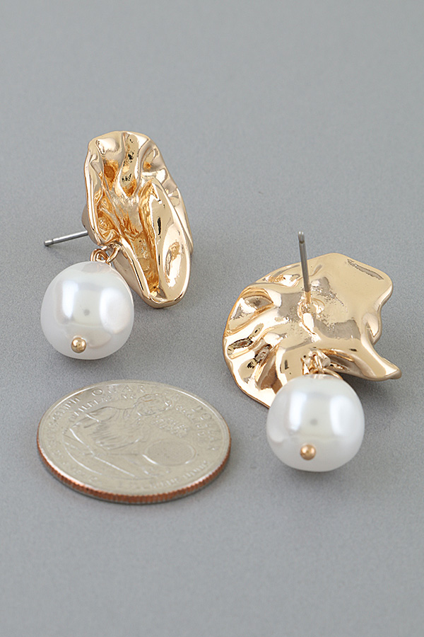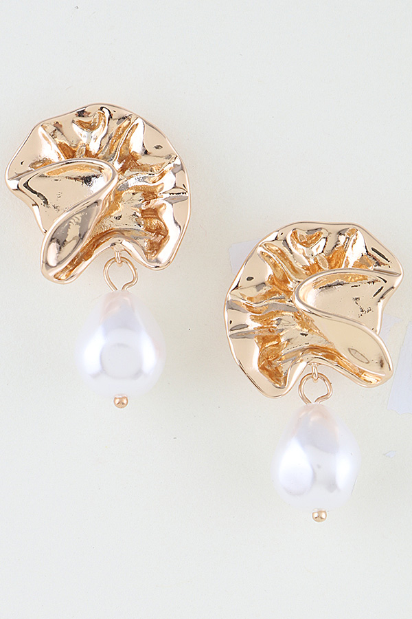 - * Polished Ruffle Pearl Stone Drop Earrings from H&D Accessories feature a sculpted, ruffled metal top with organic, flowing contours, from which a teardrop-shaped pearl stone is suspended. The polished metal design mimics the soft folds of fabric, while the lustrous pearl drop adds a luminous, refined contrast. Expertly crafted, these earrings blend artistic texture with timeless elegance, offering a bold, modern statement for any jewelry collection.
