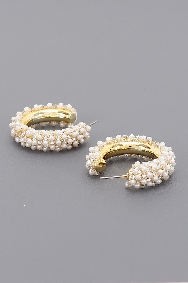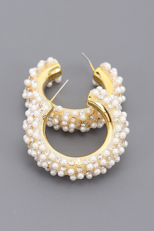 - * These are Pearl and Rhinestone Hoop Earrings from H&D Accessories. Featuring a bold hoop design adorned with clusters of pearls and shimmering rhinestones set on a metallic framework, creating a luxurious textured surface. Ideal for formal events or evening gatherings, adding a glamorous statement to cocktail dresses or elegant blouses.