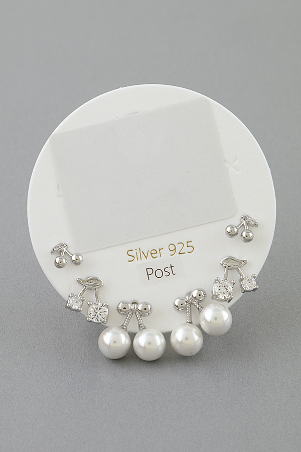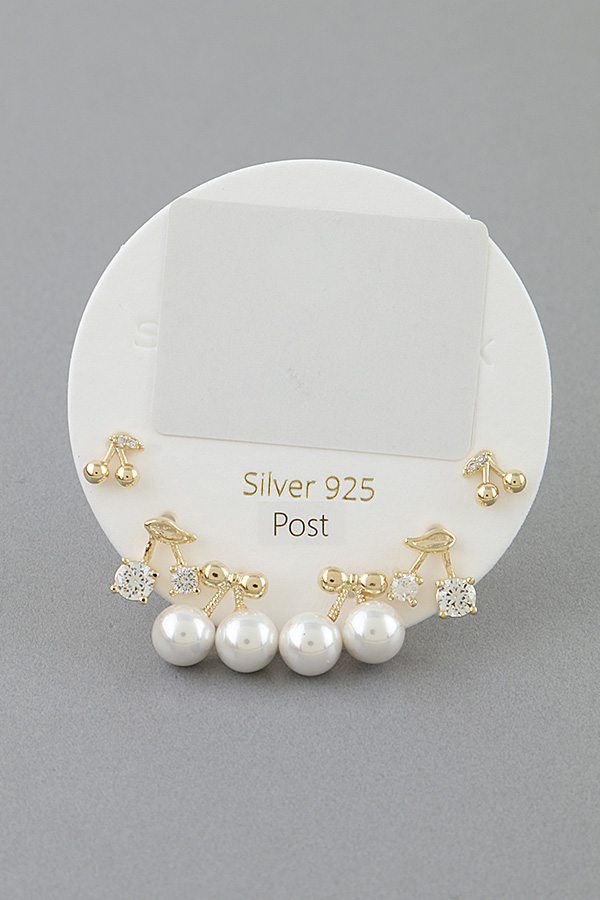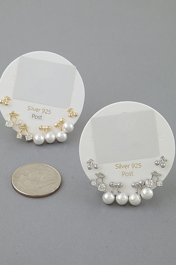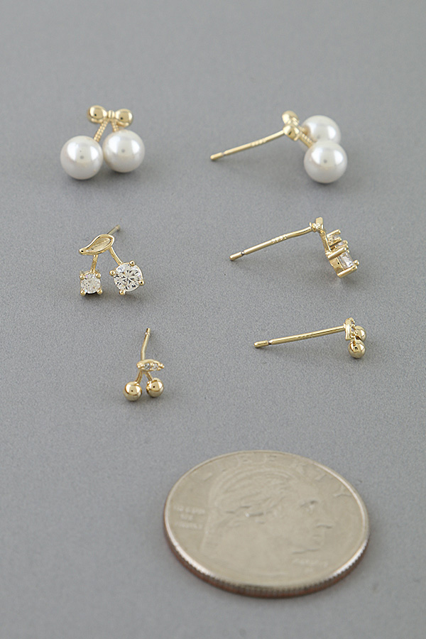 • * This Multi Cherry Stud Earrings Set from H&D Accessories includes three pairs of playful cherry-inspired stud earrings: one pair with smooth, rounded beads as cherries topped with a bow detail, one pair with faceted stones as cherries and a leaf accent, and one dainty pair with small beads and a tiny stone, all crafted with a polished finish for a delicate, charming look, lightweight and comfortable for everyday wear, perfect for mixing and matching to elevate casual outfits, office looks, or gifting to a loved one.
