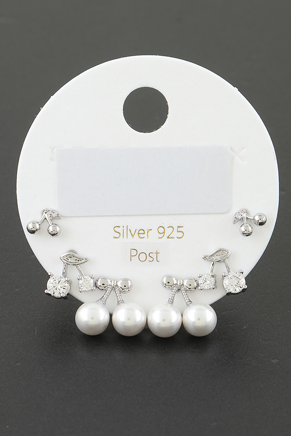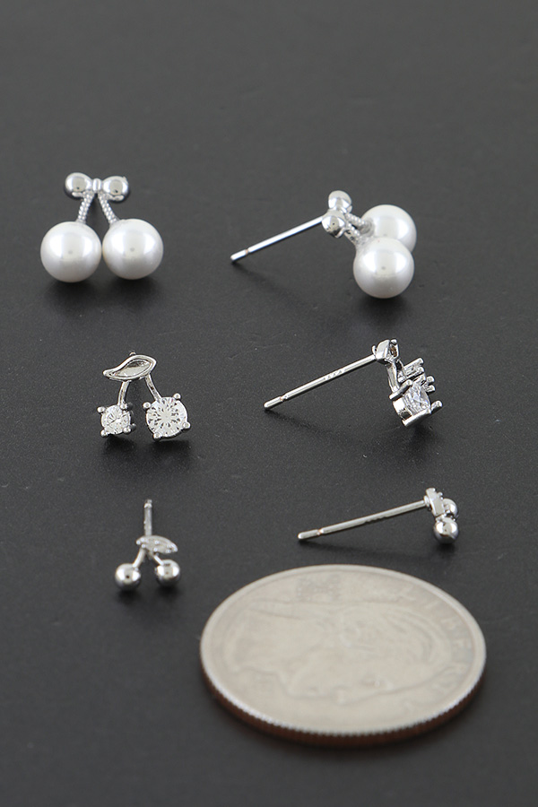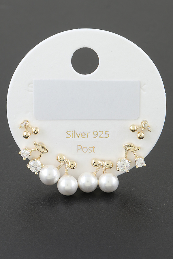 • * This is a Triple Cherry Stud Earrings Set from H&D Accessories. Crafted with Silver 925 posts, the set features an elegant design. It includes pairs of earrings adorned with lustrous white pearls, sparkling cubic zirconia, and delicate gold - toned cherry motifs, combining classic and charming elements for a sophisticated look.
