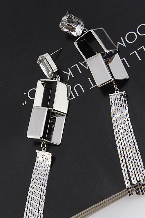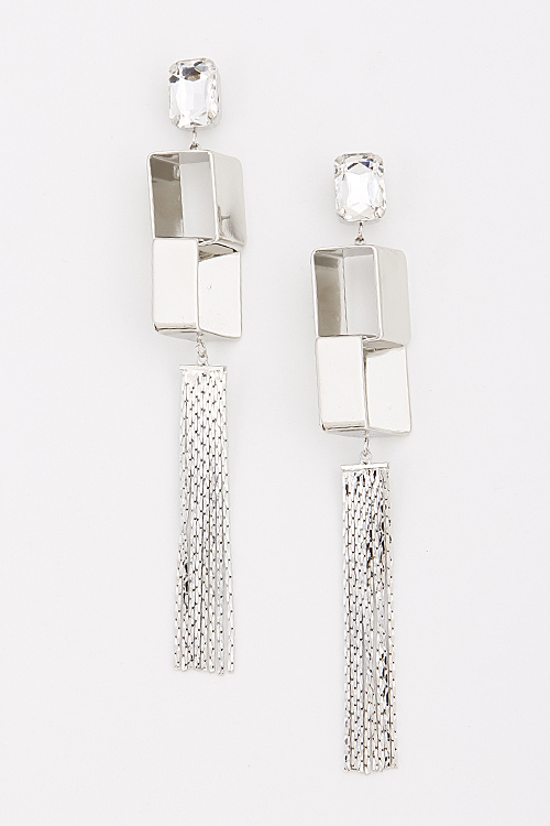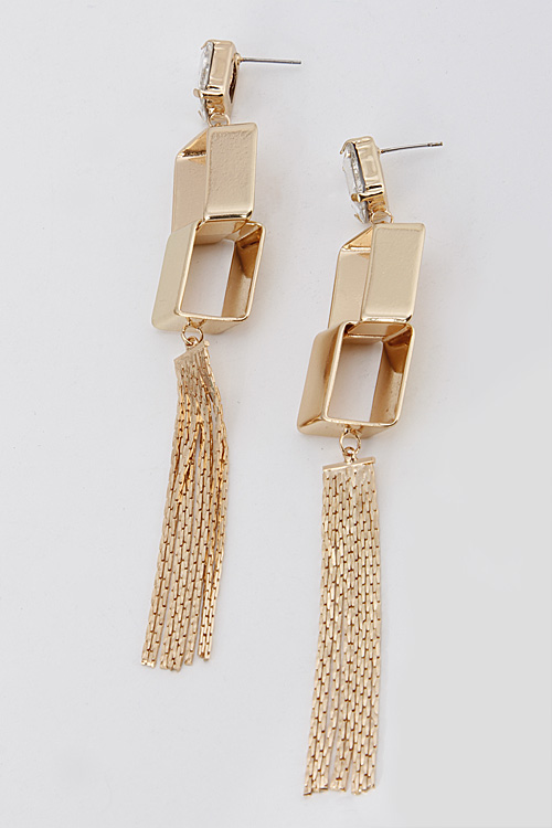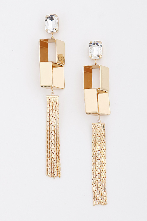 - * Two Squares Linked Earrings with Tassel and Rhinestone Detail 5LBD4 * 4.6" approx.