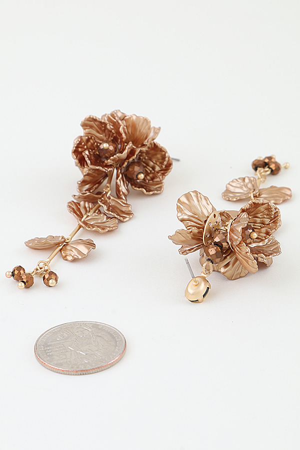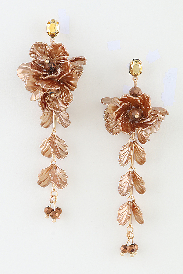 - * These Multi Crystal Petal Drop Earrings from H&D Accessories feature a lush, layered floral design with sculpted metallic petals, accented by faceted crystals and delicate leafy drops that sway with movement. Ideal for garden weddings, formal galas, or romantic evening events, they infuse any ensemble with a warm, autumnal elegance and a sense of natural opulence. The intricate metalwork and shimmering crystal accents catch light beautifully, creating a dynamic, eye-catching glow that elevates special occasion styling with a touch of whimsical luxury.
