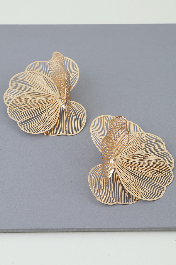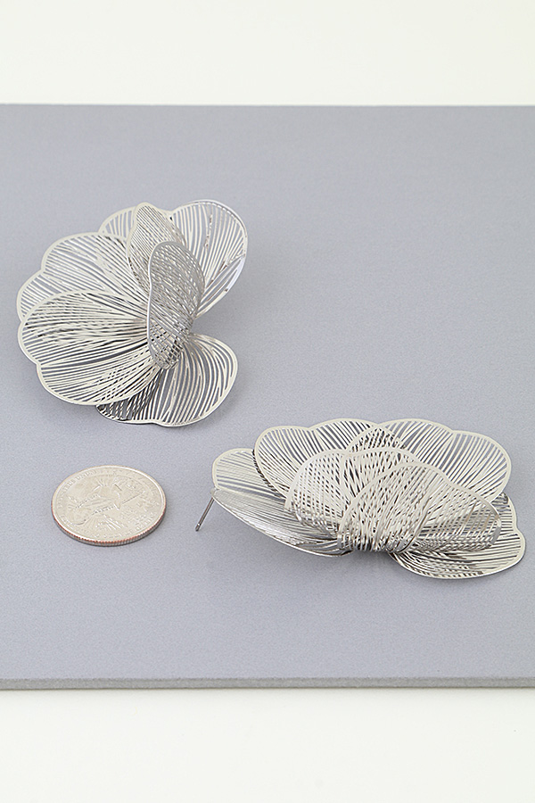- * This Delicate Petal Blossom Stud Earrings from H&D Accessories features an intricate, layered floral design. Crafted with thin, filigree-style metalwork, overlapping petal shapes create a three-dimensional, airy silhouette. The open, delicate structure adds subtle movement, while the polished finish enhances the refined, organic aesthetic. Lightweight and bold, these studs balance intricate detail with modern flair— a standout statement piece for any accessory collection.