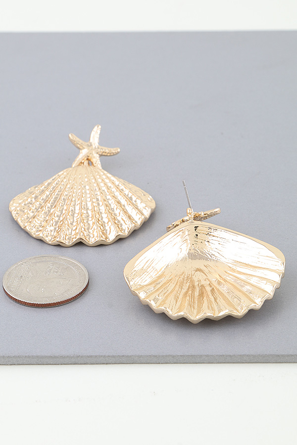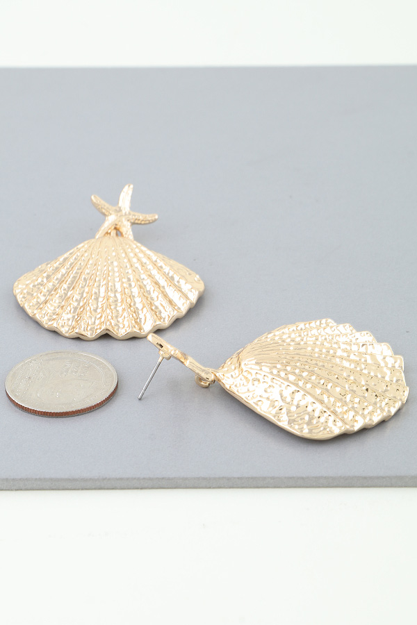 - * These are Hammered Starfish Clam Earrings from H&D Accessories. They feature a stunning design with large, intricately hammered clam - shaped elements in a gold - toned finish. Atop each clam is a small starfish, also in gold, adding a nautical and whimsical touch. The craftsmanship highlights the texture and detail, making these earrings a standout accessory with an ocean - inspired charm.